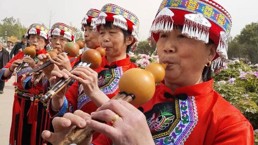 4月12日,来自聊城市阳谷老年大学的5位葫芦丝爱好者身穿喜庆的民族服饰,在曹州牡丹园一处盛开的牡丹花处演奏葫芦丝,美妙动听的曲目扣人心弦,吸引游客驻足欣赏。据葫芦丝爱好者韩士平介绍,她们喜欢花,尤其喜欢牡丹,在牡丹盛开的季节来到菏泽赏牡丹、品美食,演奏葫芦丝。