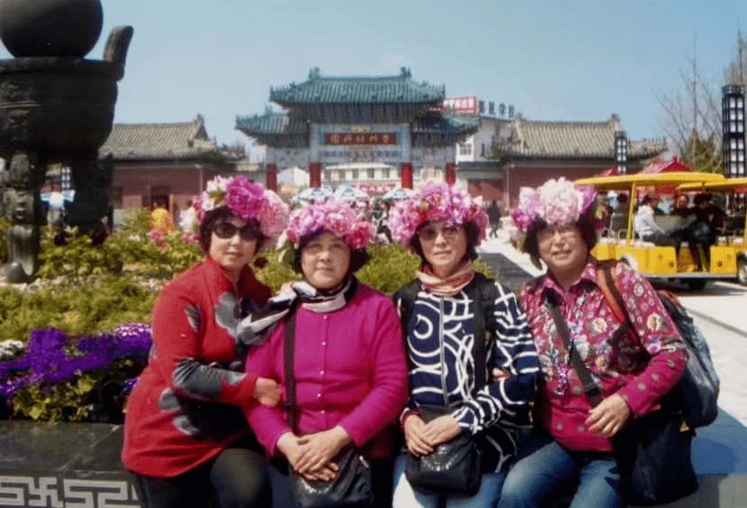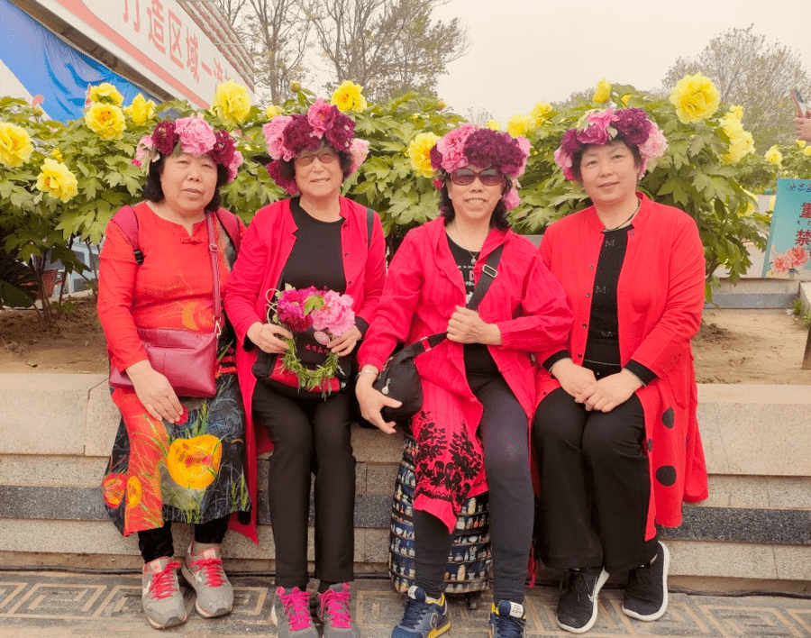 头戴牡丹花环,身穿大红色外衣,四位老人在曹州牡丹园里一边欣赏雍容华贵的牡丹花,一边用手机拍照。四位老人的名字分别为赵黎、屈玉珍、王红梅、谭淑芬,平均年龄70岁。