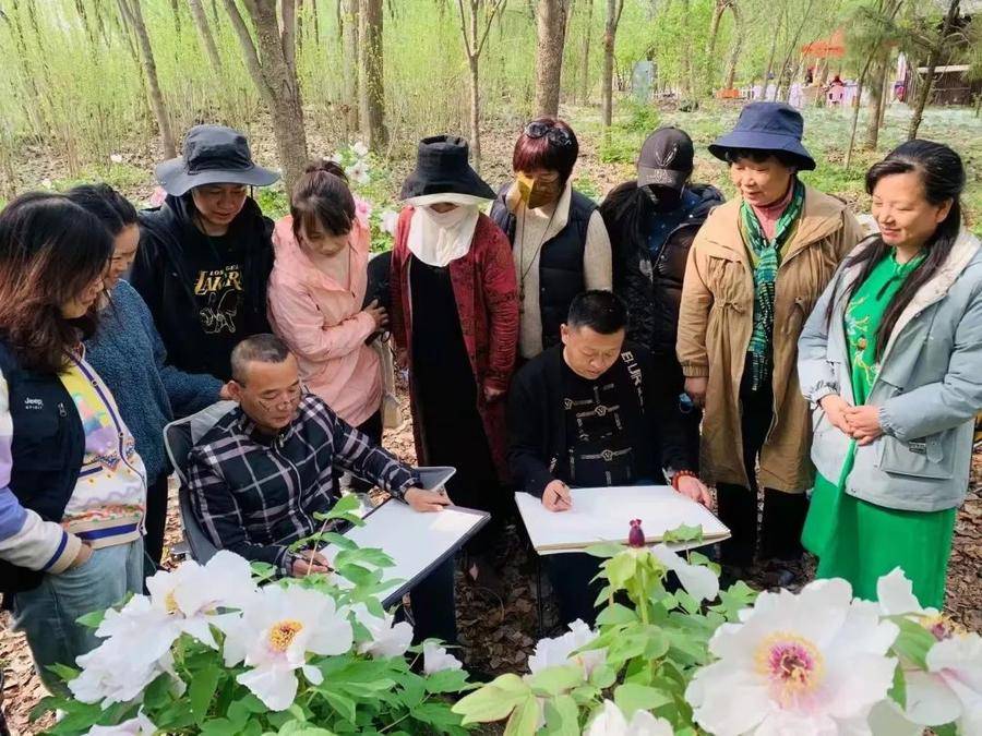 4月10日一大早,在曹州牡丹园进园的人流中,一群带着画板的写生人格外引人注目。他们来自天津霍春阳传统绘画艺术研究室,一行30多人,是专程来这里写生的。