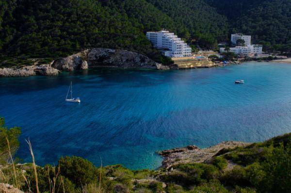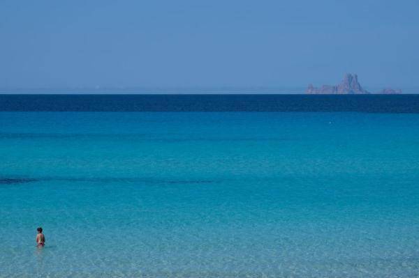 ↑这是4月10日在西班牙巴利阿里群岛伊维萨岛拍摄的雍加海湾风光。