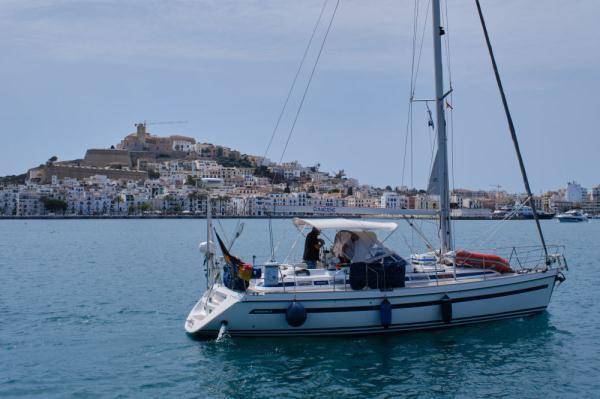 ↑4月10日,一艘帆船驶入西班牙巴利阿里群岛伊维萨岛港口。
