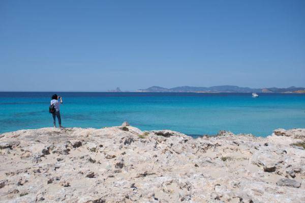 ↑4月11日,一名游客在西班牙巴利阿里群岛福门特拉岛海边游览。