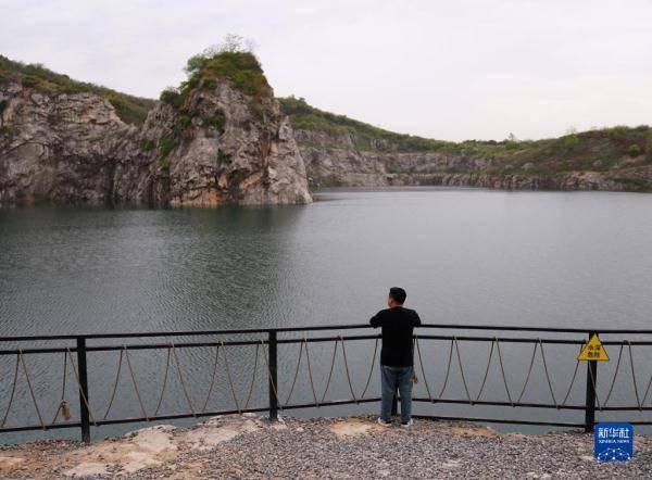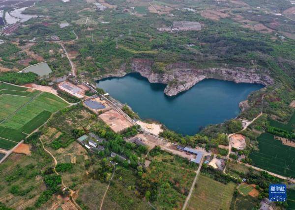 “深蓝计划”所在的废弃矿坑(4月13日摄,无人机照片)。这个矿坑深达108米,原本废弃多年,如今已是网红打卡地。
