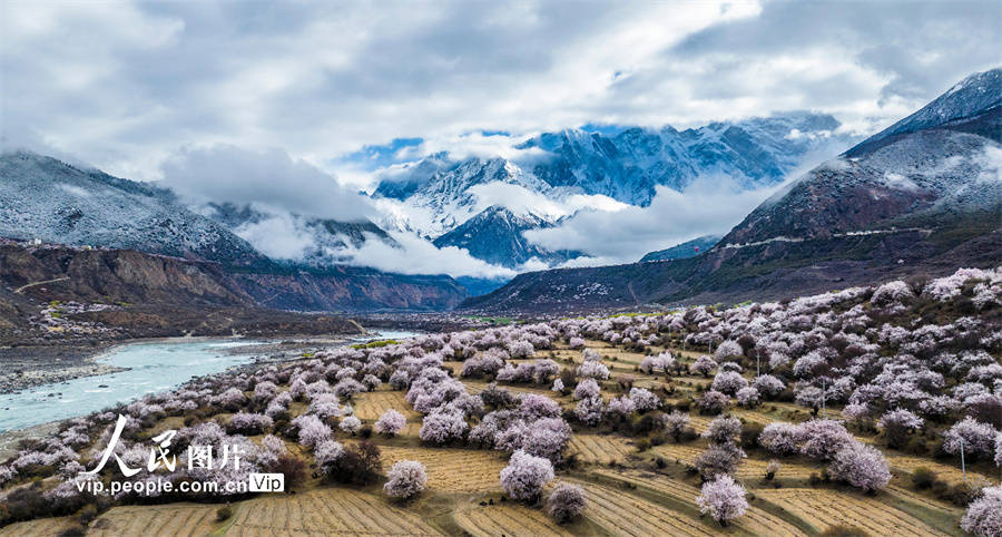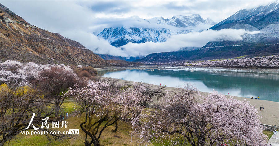 近日,位于西藏自治区林芝地区的南迦巴瓦雪山云雾缭绕,与盛开的桃花相映成景。王华摄(人民图片网)