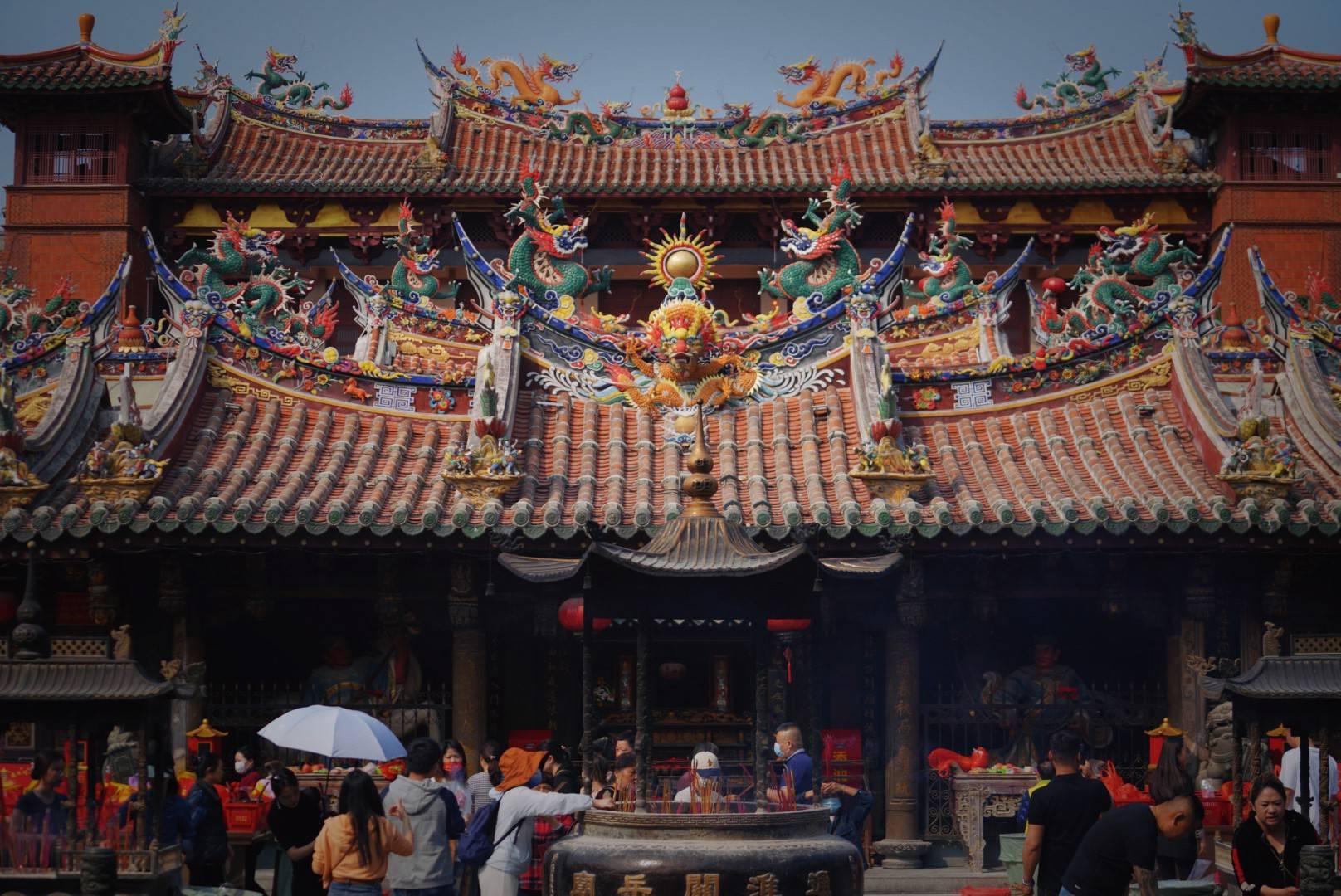 一座红砖白墙的建筑前烟雾缭绕,年轻的,年老的,很多人恭敬地在门前燃起香,缥缈中带着威严,一派“庙貌巍峨,俎豆礼容”的风采。这就是泉州通淮关岳庙,已经有一千多年历史,武成殿、崇先殿、三义庙三座殿堂并列峙立,有着闽南传统建筑风格的燕尾脊、穿斗式木构架,在2011年被列入省级非物质文化遗产名录。
