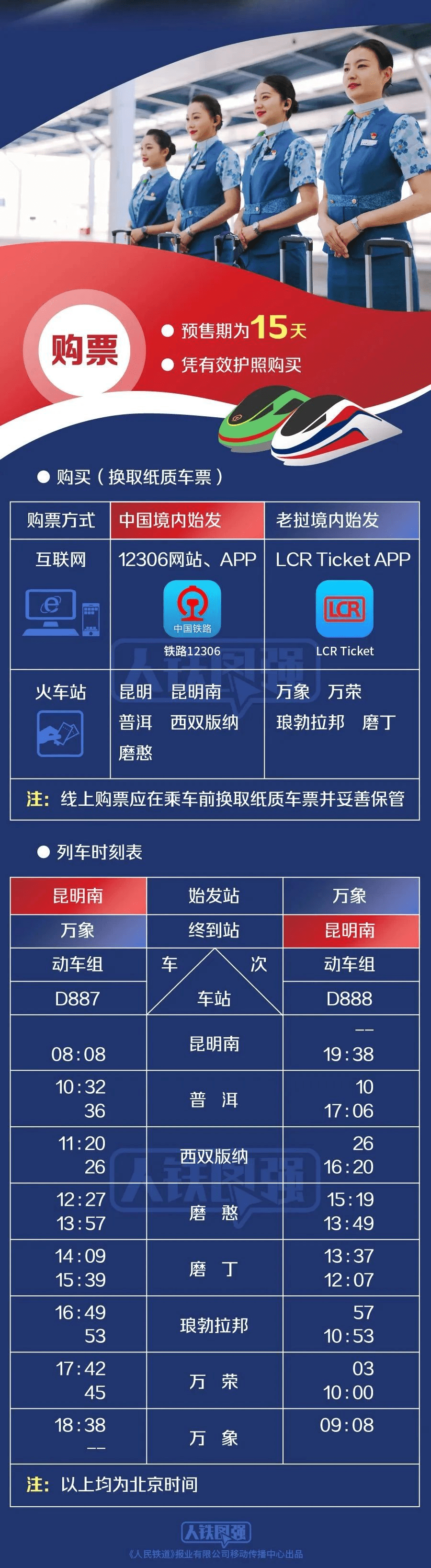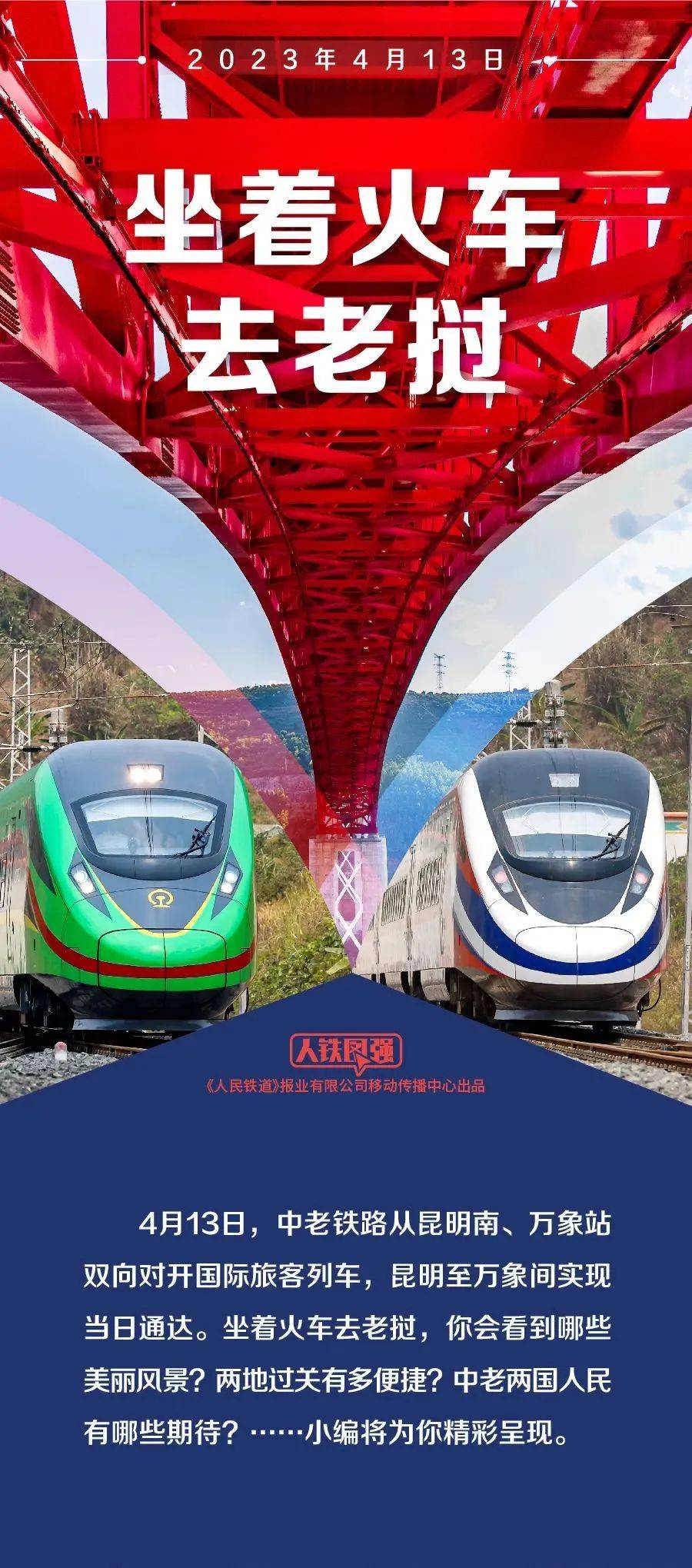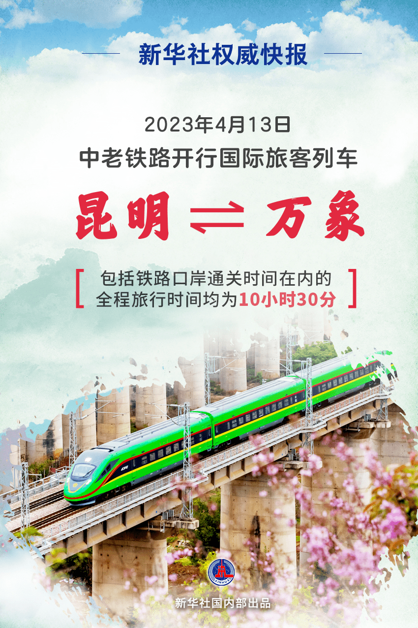 4月13日,中老铁路国际旅客列车开行。北京时间8时8分,D887次列车从中国昆明南站驶出,向南而行;一小时后,北京时间9时8分,D888次列车从老挝万象站出发,向北飞驰。中老铁路从昆明南、万象站双向对开国际旅客列车,昆明至万象间实现乘火车当日通达,两国间通行更加便利。