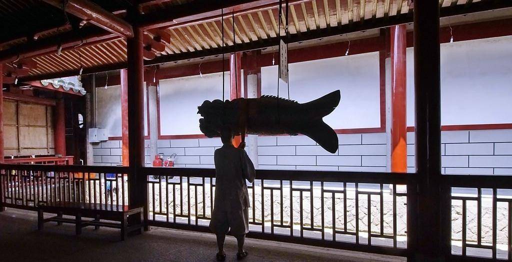 而在大殿后面的院中,还有三棵铁,两雌一雄,据说是五代后梁开平二年(908年)所植,至今也有上千年的树龄了,这就是镇寺三宝之一的“千年铁树”,而另一宝则是斋堂里的一口铁锅,叫做“千僧锅”,其直径有1.6米多,据说一次煮满需20担水、500斤大米,可供上千僧人食用,而斋堂门口还有一只大木龙鱼,龙鱼敲响,就是寺庙僧人开饭的时候。