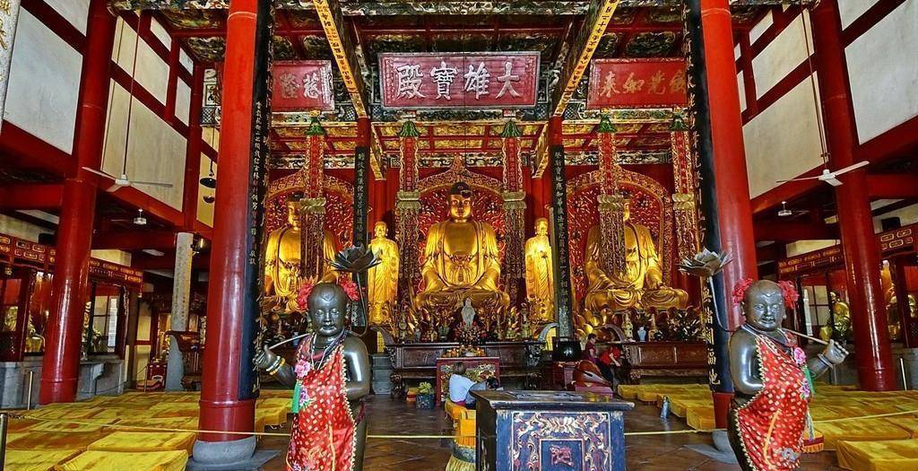 而前面便是大雄宝殿,殿中供奉的是释迎牟尼三世佛像,十八罗汉像分列两侧,庄严肃穆,还有两个小孩铜像在旁边,据说摸右边的一下可生女孩,摸左边的一下可男孩,现在都被人摸得很是光滑。而殿中最吸引人注意的还是天花板上的图案,其共有242块,绘制的是各种动物图案,龙、丹顶鹤、麒麟、大象、白马等等,而大殿后面还有一张木桌,这张木桌看似不起眼,但却是涌泉寺镇寺三宝之一的“铁丝木”,据说是从建寺的时候传下来的,而木桌前的“阿弥陀三圣像”金光灿灿,整体都是贴金而成,重约1.15吨。