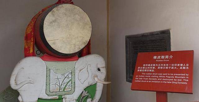 在白塔山有三宝分别是青铜钟、紫金树和象皮鼓,这也被称为白塔寺内的“镇寺三宝”,可惜的是由于历经时间之久,这三宝都有一定的损害,其中紫金树是后人重新种植的,而象皮鼓更是世间罕见之物,相传是在元代时期,一僧人游历到此,向寺庙中捐献的,但可惜在近代也遭到了损害,现在游客看到的展览品是重新仿制而成的。
