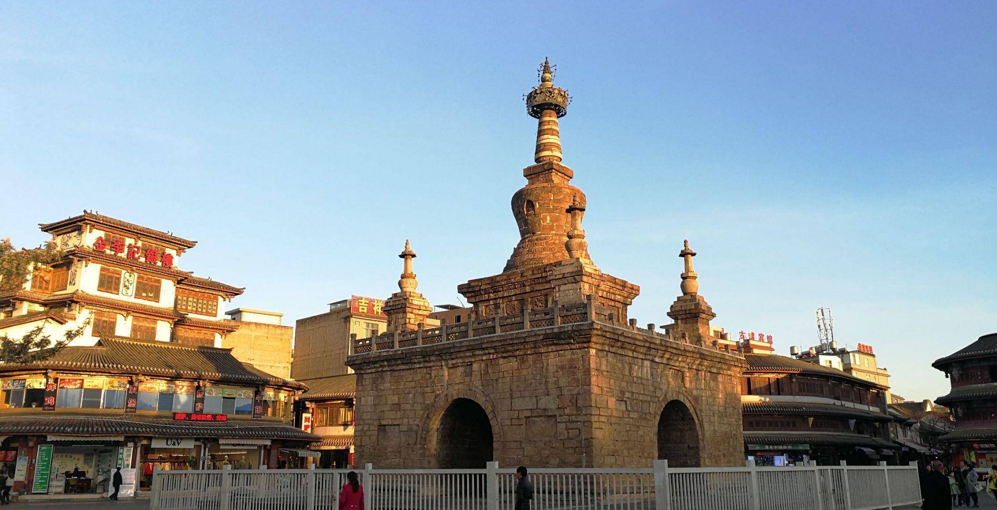 妙湛寺山门前还有座金刚宝座式石塔,又名金刚塔、穿心塔,免费开放,为明朝年间建造,在清代康熙年间曾进行过两次修缮工作,是国家级文物保护单位。金刚塔是为了礼佛更简单方便而建造的过街塔,四面都有券门,车马都可以在其中畅通无阻,当然现在是围起来了,只能远远看着了。在券门的道路交叉中心顶端还镶嵌9尊佛像,呈四周包围形状,每尊佛像都用菩提树隔开。