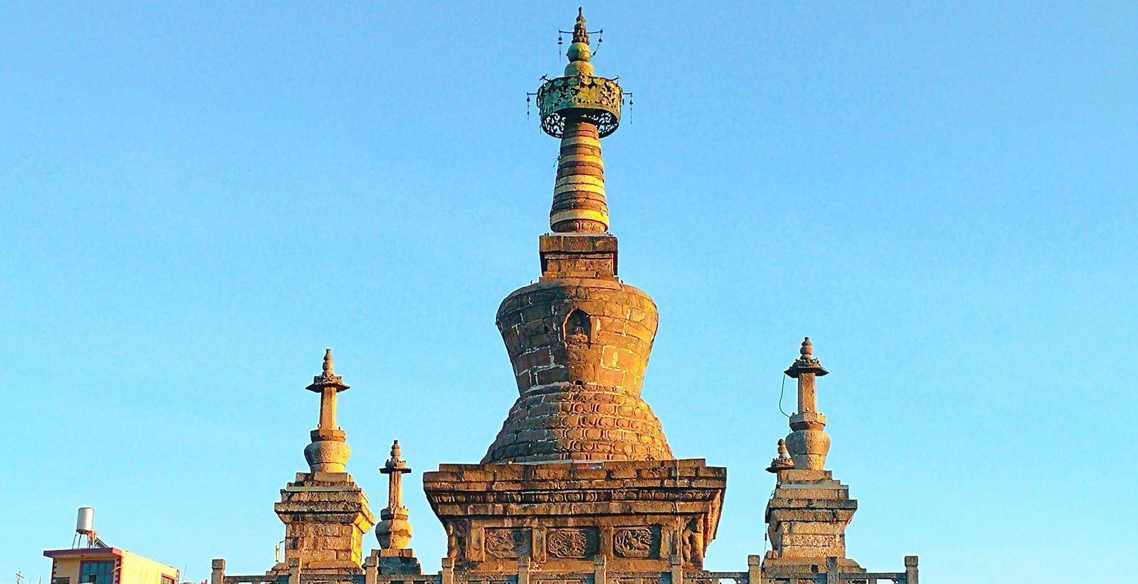 塔身之上是方形须弥式的塔脖,伞盖上站立着铜铸的武士像,武士手持琵琶、剑、塔等物品,这是四大天王像。华盖上也有四大天王像,但是需要仔细查找才能找到,设计得极为精巧。在四个角落里还有藏式的瓶型小塔,小塔的形状和结构基本相同,造型简单,没有多余的装饰,下方也有方形状塔座,有4.4米高,1.4米边长。