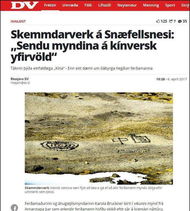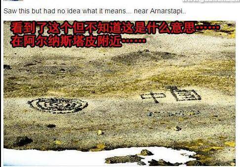 原因是一名叫KarolaBruckner的网友发出了一张冰岛的照片,照片上有两个造型,一个是用石块拼成的“中国”字样,另一个则为石块拼成的心形图案。该网友发言说,“看到了这个但不知道这是什么意思……在阿尔纳斯塔皮附近……”