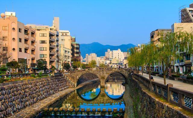长崎市中心附近的“眼镜桥”是日本国内第一座拱形石桥,建于1634年,是日本第一座拱形石桥,与岩国的“锦带桥”、东京的“日本桥”并称日本三大石桥,是日本的国宝之一。从正面的角度拍眼镜桥时,因拱桥倒映在河面的关系呈现双圆形,看起来就像是副圆框眼镜一样,而有了这个名称。此处也是日本社群网站上常见到的热门拍照景点。