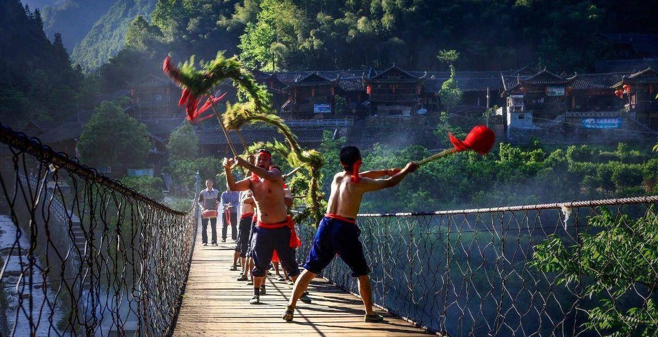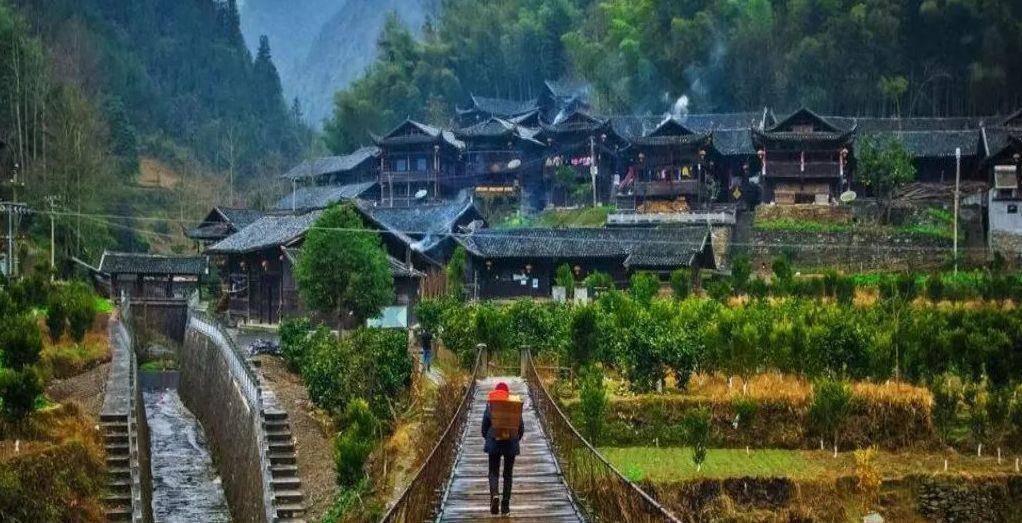 可是苦于无法渡河,只能干着急,此时河中缓缓升起一座小木桥,两夫妻才到达了对岸,并且在这里定居下来。这对年轻的夫妻正是彭家寨的开创者彭氏彭怀伞和他的妻子。如今村寨内大多是彭氏族人,有45户人家,共计250多人,是典型的血缘型村寨。彭家寨在古时这是还是兵家必争之地。东面是叉几沟,沟上架着160多年前修建的凉亭桥,又名凉桥。寨子前方是龙潭河,河上架有40米长铁索桥,与外界相连。