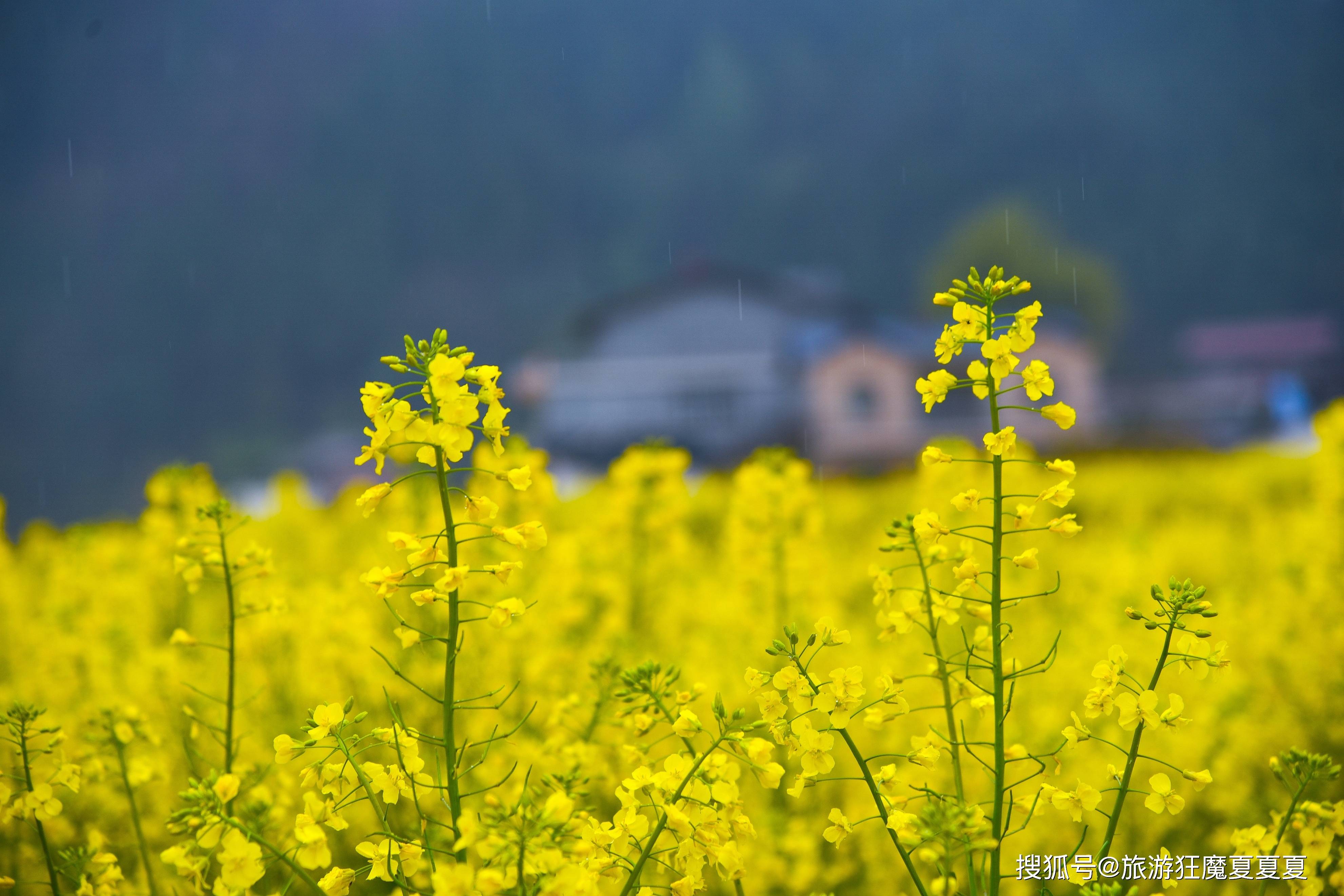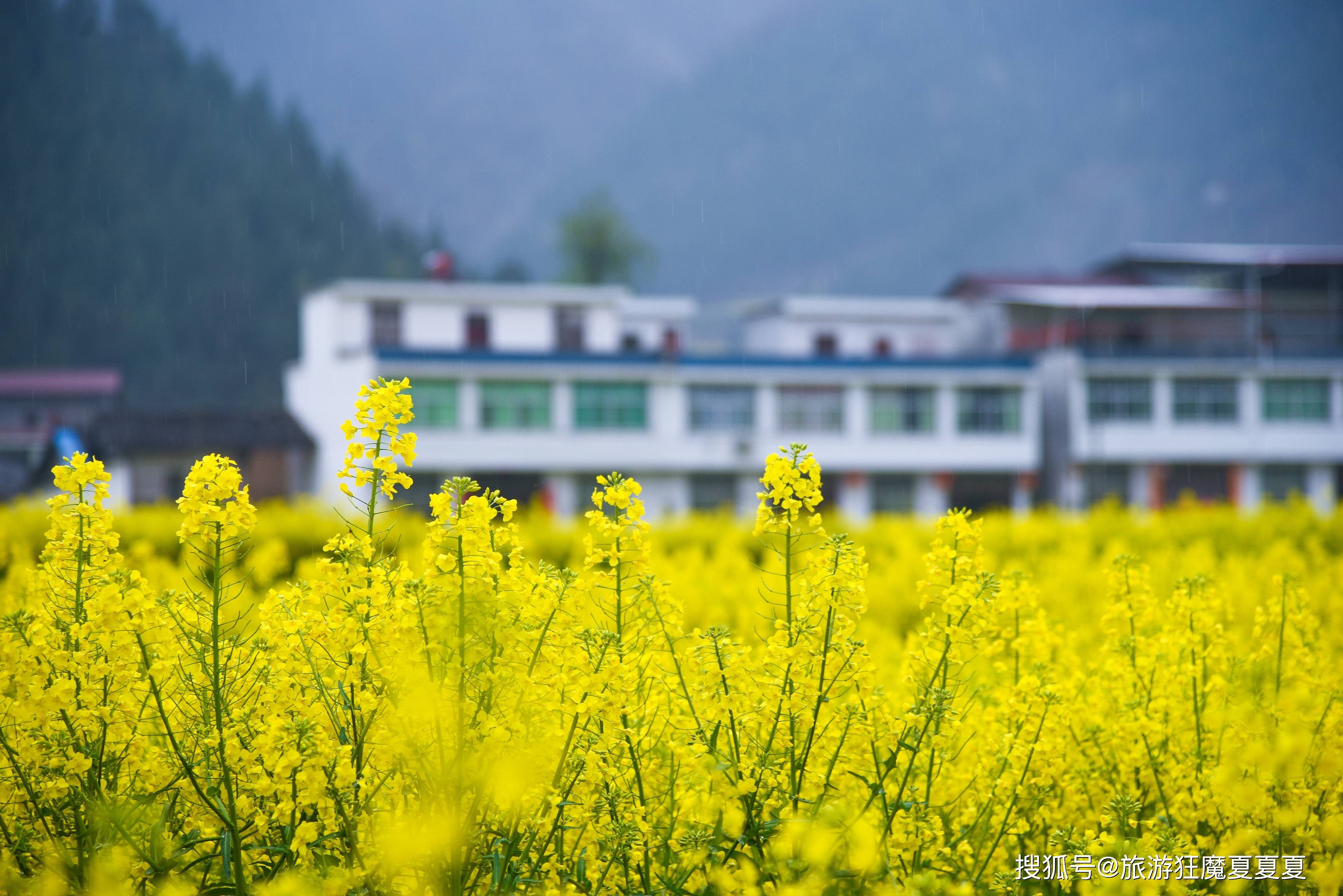 几多夜雨,油菜花开,伴随淅淅沥沥的春雨,走在黎坝镇的油菜花海之中,不远处山间的水雾腾起,与花田里的民居交相呼应,形成了一幅绝美的春日画卷,仿佛整个春天的色彩都浓缩在了这里,随便站在一个角落都能来一张人像大片,让人沉醉其中。