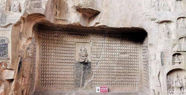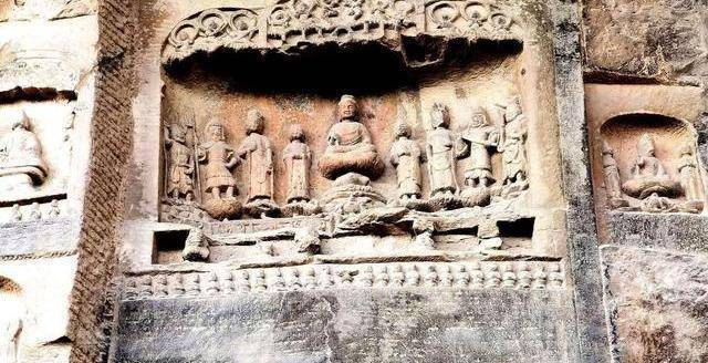 石窟外面有一个平平无奇的小佛龛,下面还有一排模糊不清的字样,别看这个小佛龛不起眼,但是其跟龙门石窟中的卢舍那大佛极其相似,不管是佛像的神态、姿势,以及两旁的小佛像都差不多,甚至可以说是按比例来缩放的,因为没有考据,因此也不知道到底是龙门石窟的先建,这里后仿,就是这里先建,龙门石窟的后仿。