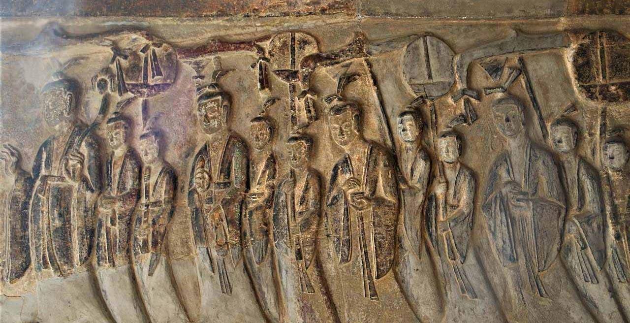 这个礼佛图便是“帝后礼佛图”,共有三层六组,上刻有帝、后、文武大臣、嫔妃、侍女、僧人、神王、怪兽、乐伎等等,构图非常严谨,而且技法娴熟,非常逼真、精美,这个跟洛阳龙门石窟的《帝后礼佛图》相差无几,但是洛阳龙门石窟的已被盗往国外,现在国内就只有这里仅存一副,这更加显得其珍贵无比。