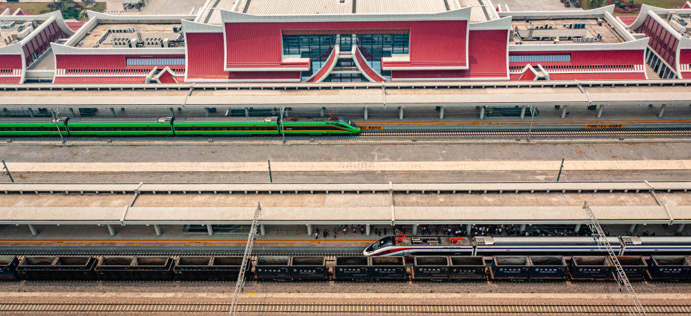 4月13日,“复兴号”(上)、“澜沧号”动车组列车停靠在中老铁路磨憨站(无人机照片)。新华社记者 胡超 摄