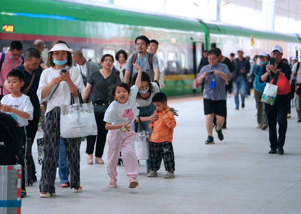 4月13日,乘坐D887次国际旅客列车的旅客抵达老挝万象站。新华社记者 邢广利 摄
