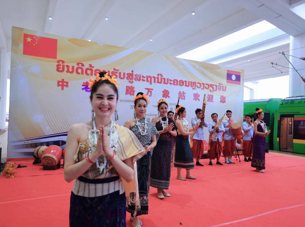 4月13日,在老挝万象站,工作人员欢迎乘坐D887次国际旅客列车的旅客。新华社记者 邢广利 摄