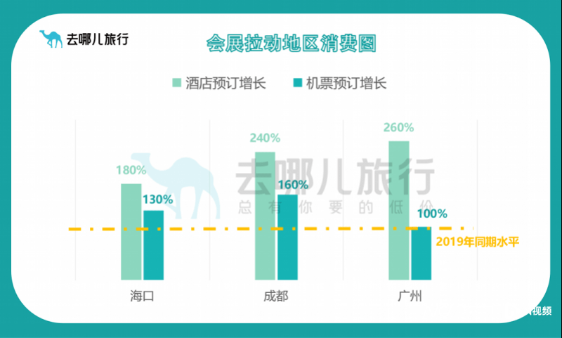 去哪儿大数据显示,截至目前,2023年消博会期间(4.9-4.15)前往海口的机票预订量同比2019年增长三成,2023年广交会期间(4.15-5.5)前往广州的机票预订量已恢复至2019年同期水平,2023年春糖会期间(4.6-4.12)前往成都的机票预订量同比2019年增长六成。
