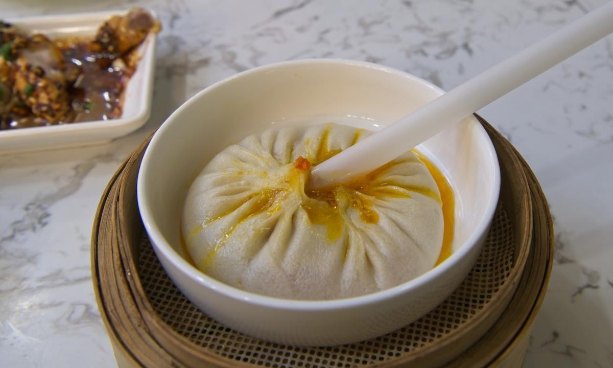 蟹黄汤包具有面细洁白,皮薄馅大,汤多肉美,油黄味鲜的风味特色。蒸熟的包子呈半时尚状,用筷子夹起晃动时,里面的汤汁隐约可见。吃时先咬开一个小口子,再慢慢吸出汤汁,蟹黄滋味美醇,配上香醋、姜丝食用,更是味美爽口。