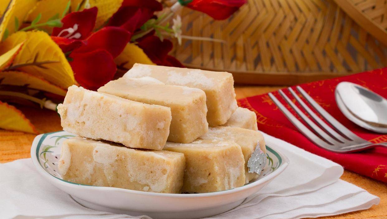 玉带糕以冰糖、桃仁、红梅、青梅、桂花、莲子、桔饼、米粉、麻油为原料,经科学方法,采用传统工艺精制而成。黄色的核桃似黄金,绿色的青梅似翡翠,莲子和桔饼如同珍珠玛瑙;四周有米粉镶成的白边,酷象一条玉带。玉带糕不仅香甜可口,而且具有滋阴强身、润肠益气、清炎健胃、生津润肺等功能。