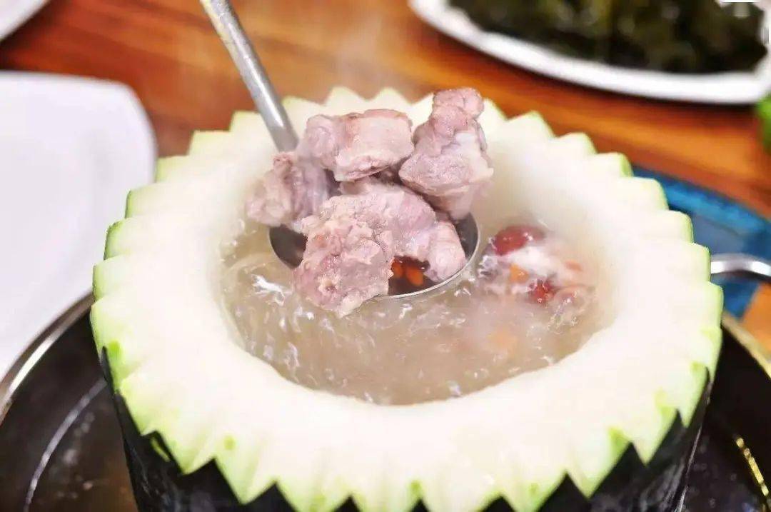 下面说的这道菜食材可太丰富了!就连外观也是非常特别!将一个冬瓜在约三分之一处切下,将内里掏空,里面装上用鸡鸭虾蟹等食材煲成的汤,看着既特别又赏心悦目。