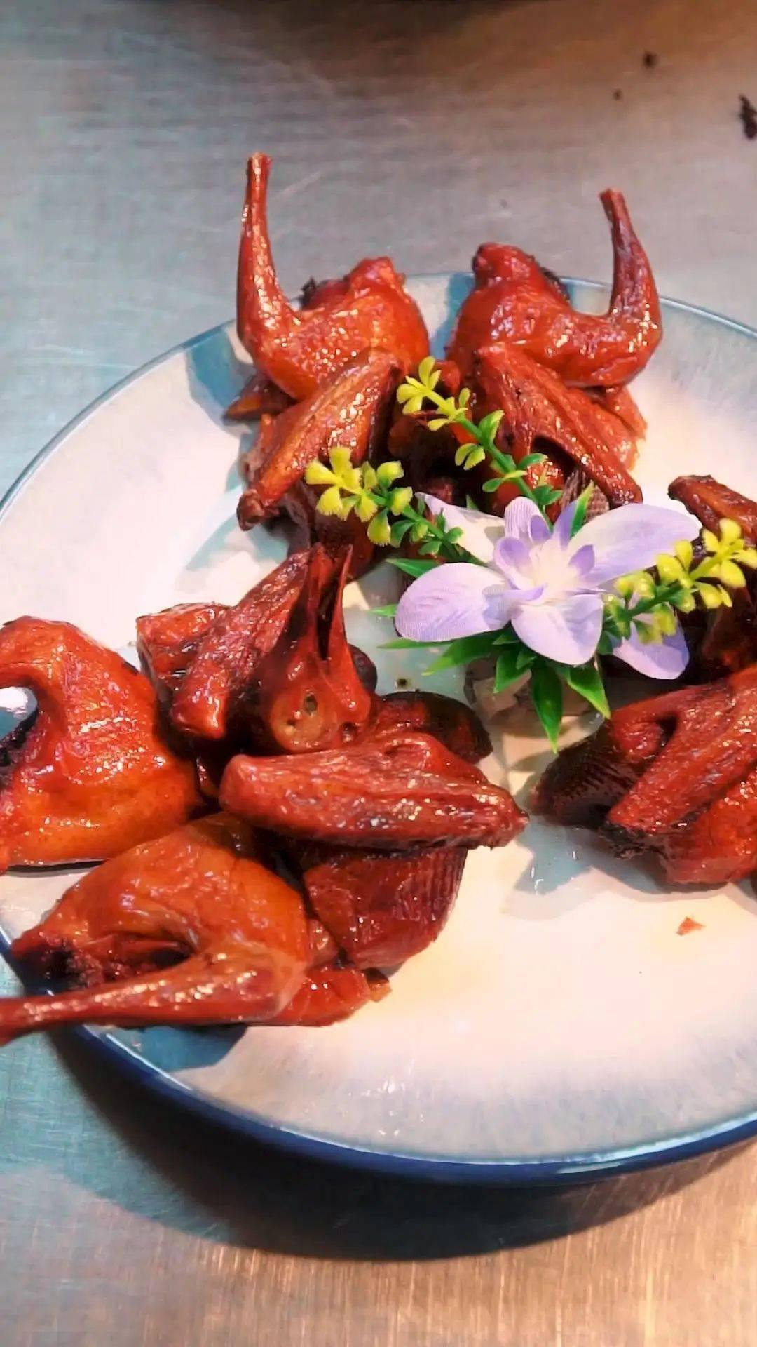 红烧乳鸽在广东非常受欢迎,是一道传统名菜!一道乳鸽被端上桌。乳鸽的皮早已被酱汁浸润,呈现出漂亮的棕红色,一整只乳鸽摆在盘中,旁边用时蔬点缀,看着就非常漂亮。