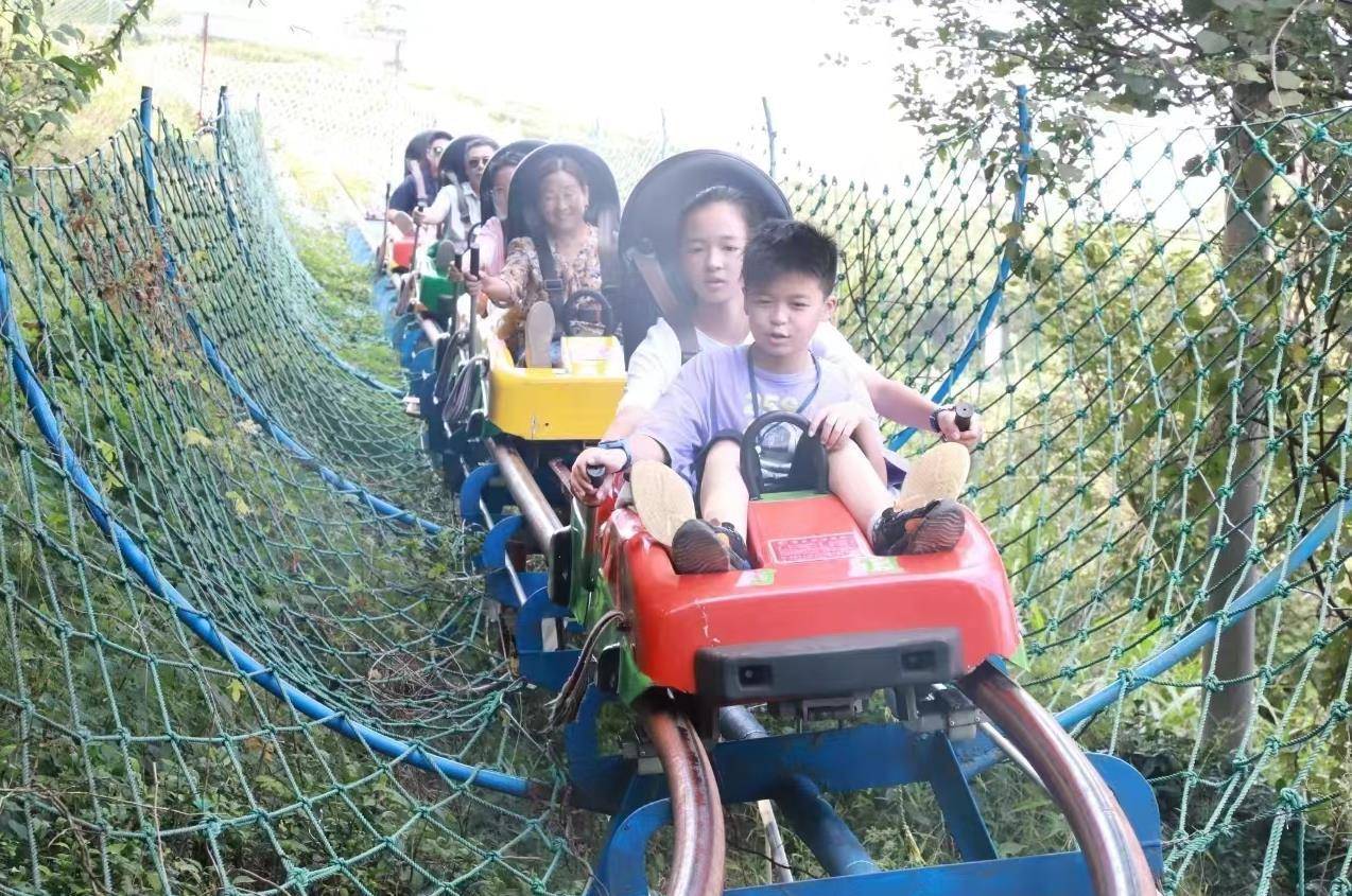 茶山滑道景中行。茶山滑道全长1200多米,整体落差达158米,势如盘龙,依山就势甚为壮观。滑行于观光滑道上,感受在风中穿梭,万亩茶山就在脚下。滑行速度可自行掌握,上行代步,下行娱乐,即惊险刺激,又安全舒适。