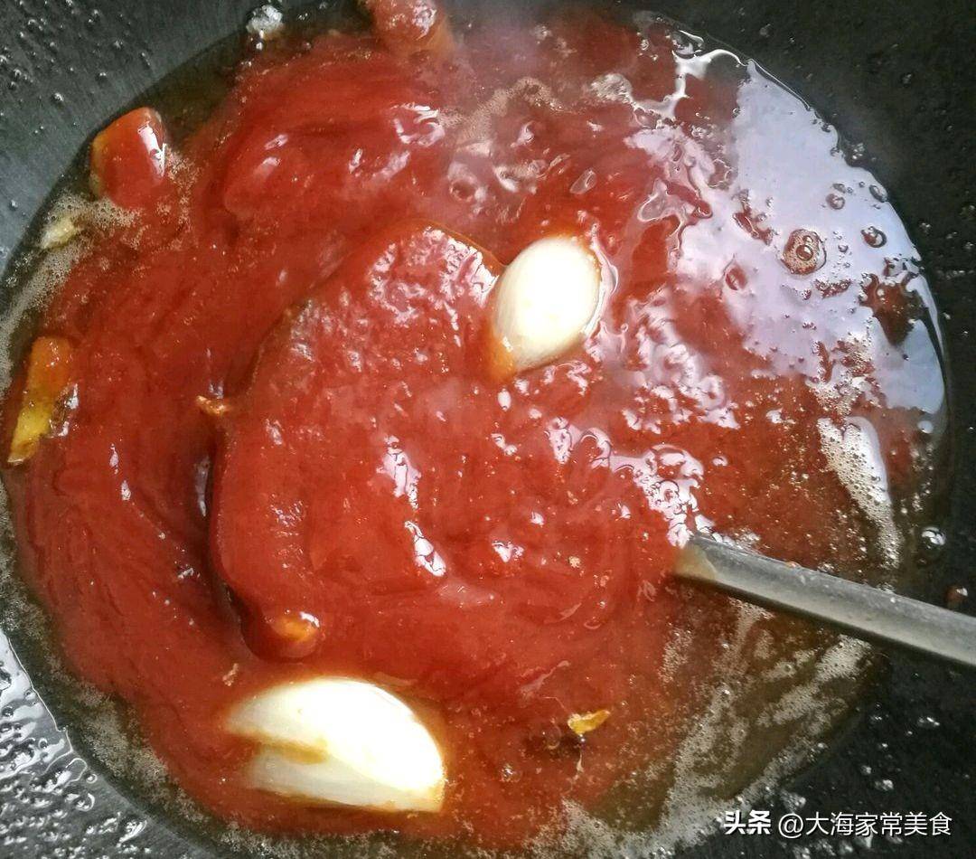 步骤三:另起锅,放入刚用过的油,放两片姜,几段葱,家没有大葱了洋葱代替,放入两大瓶番茄酱。