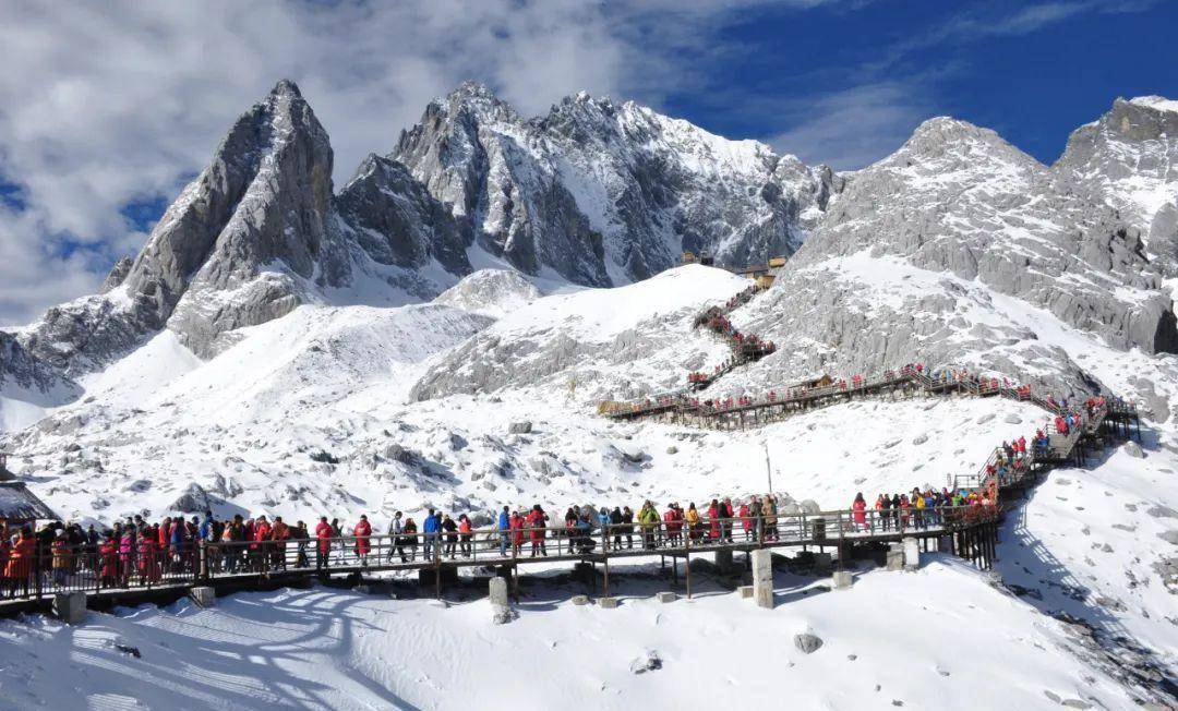 坐在缆车里,随着海拔的升高,远近的岩石、山脉和积雪越来越清晰。下来缆车,眼前是绵延婉转的步道,来自全国各地的游客,在步道上挑战着自己的极限。玉龙雪山4680米的峰碑,是每个游客心中的圣地。