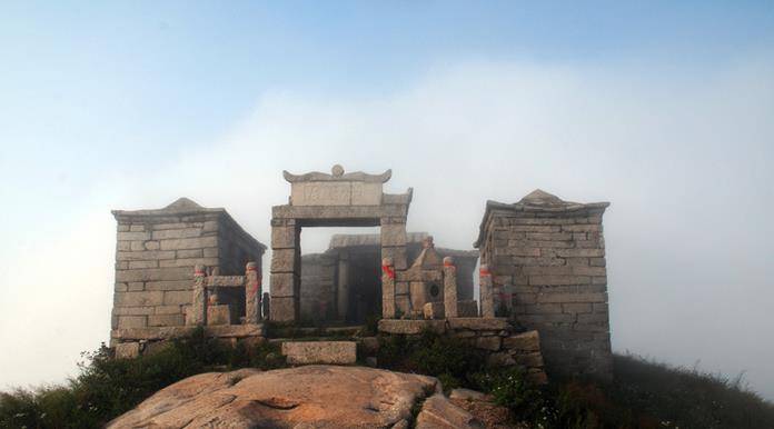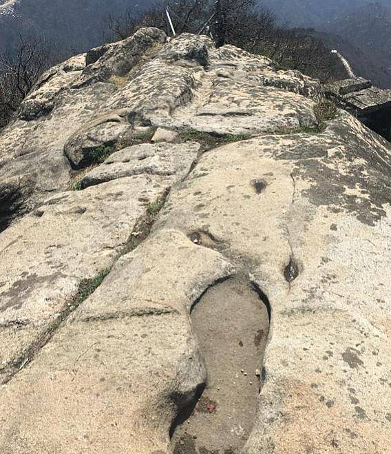 仙人的大脚印。往西金顶右侧的山头也有一栋石头小殿。据说,那座比金顶矮的山头叫玉皇顶,那栋石头小屋是玉皇殿。