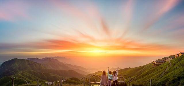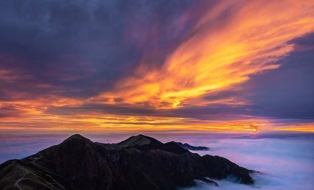 早起的友友可以看云霞,是武功山金顶日出前十分壮美的景观。日出之后,金光灿色彩。日落的武功山风景如画,高山草甸,日出日落,美不胜收。