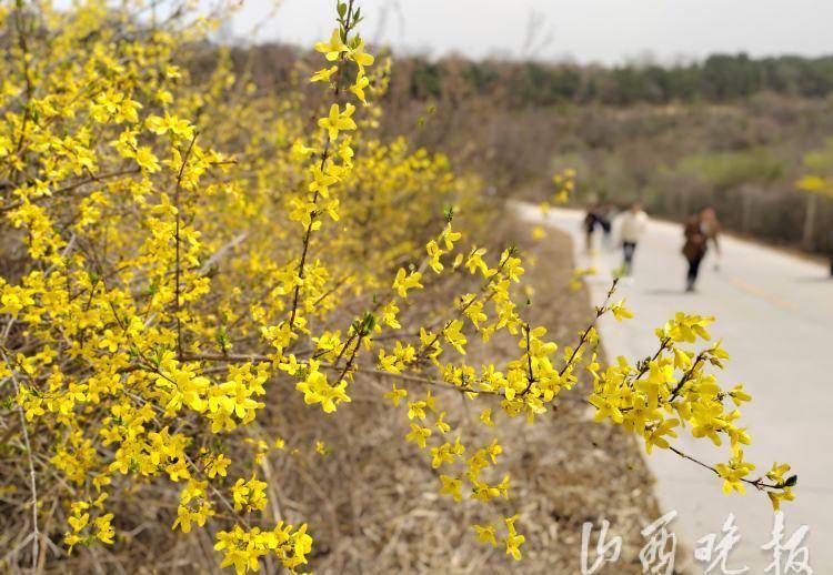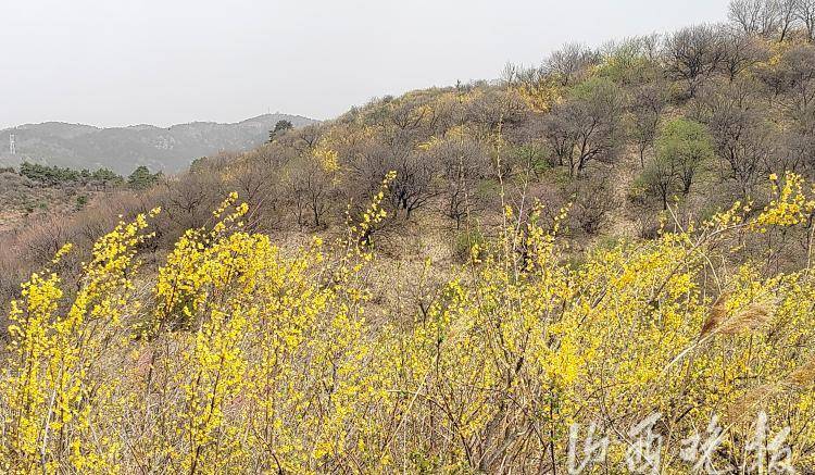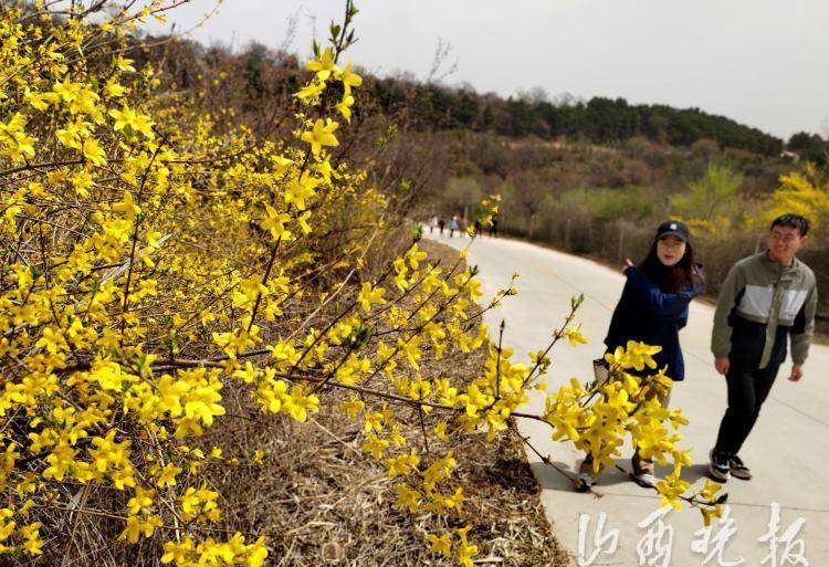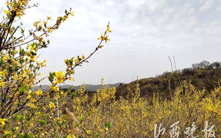 “百花迎春连翘先,漫山尽披黄金甲”、“不负春光,相约安泽”。4月11日,在临汾市安泽县黄花岭,游客们正在欣赏漫山遍野的连翘花海。