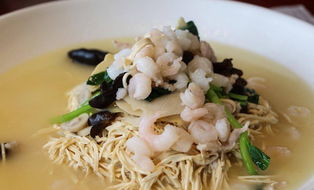 这也是一道考验刀工的菜。切的极细的干丝,用沸水烫软,最后堆叠进盘中,放入虾仁、金华火腿、香油等,是扬州非常有名的一道菜之一。