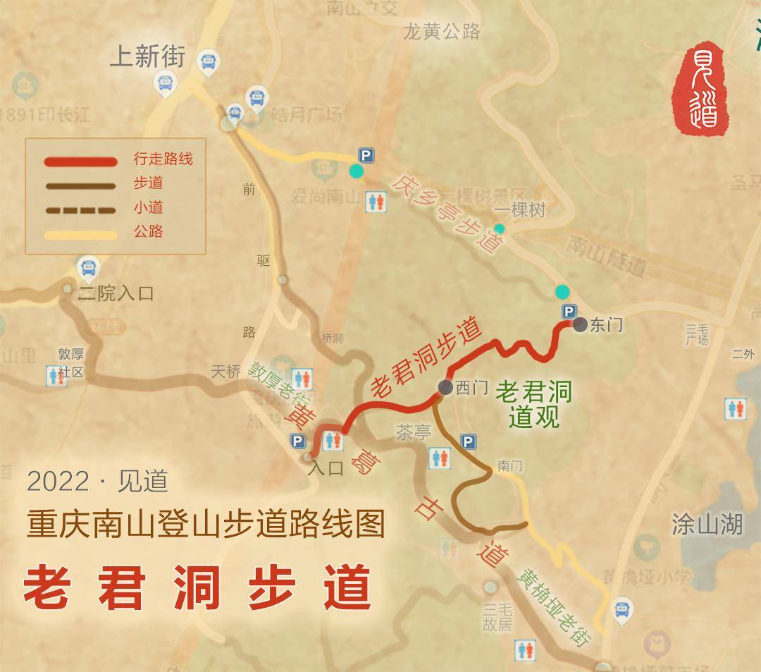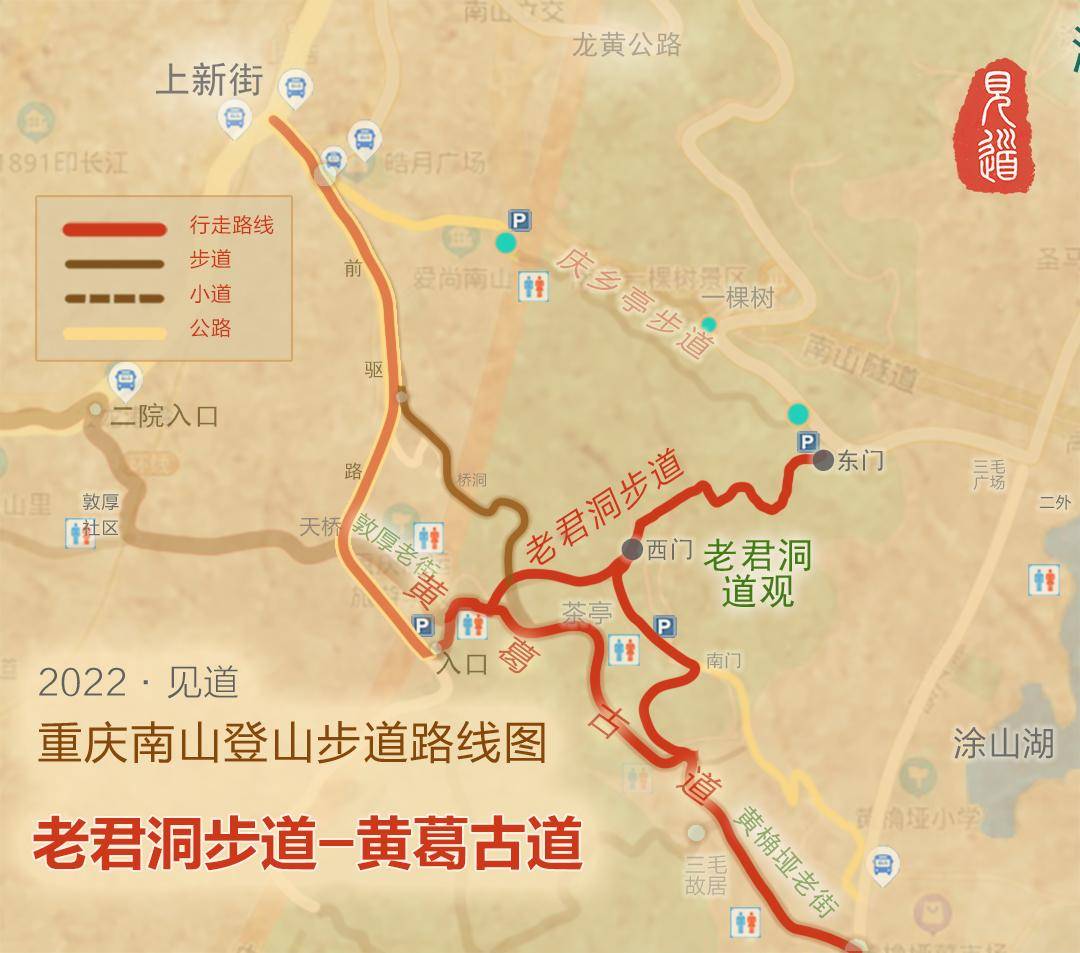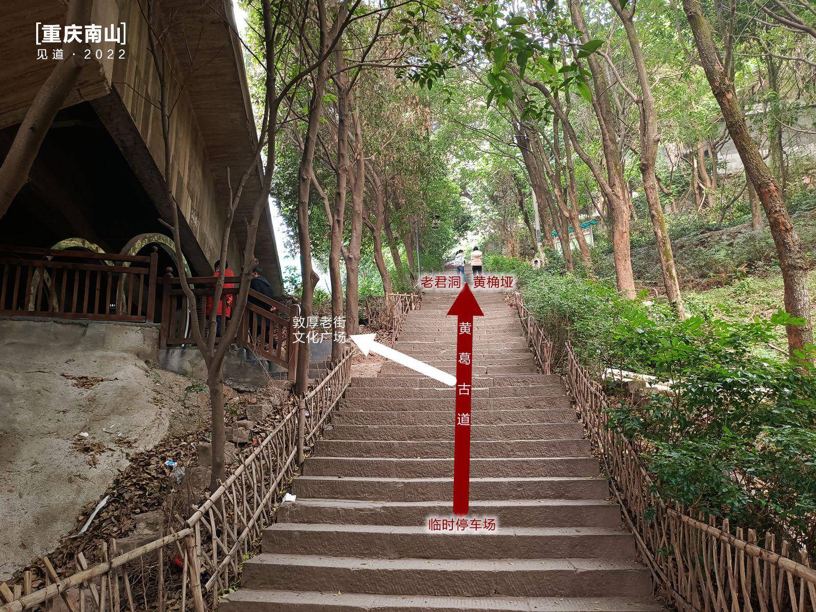 在距离上新街三岔路口一公里左右,有个黄葛古道临时停车场,那里也有个步道入口。