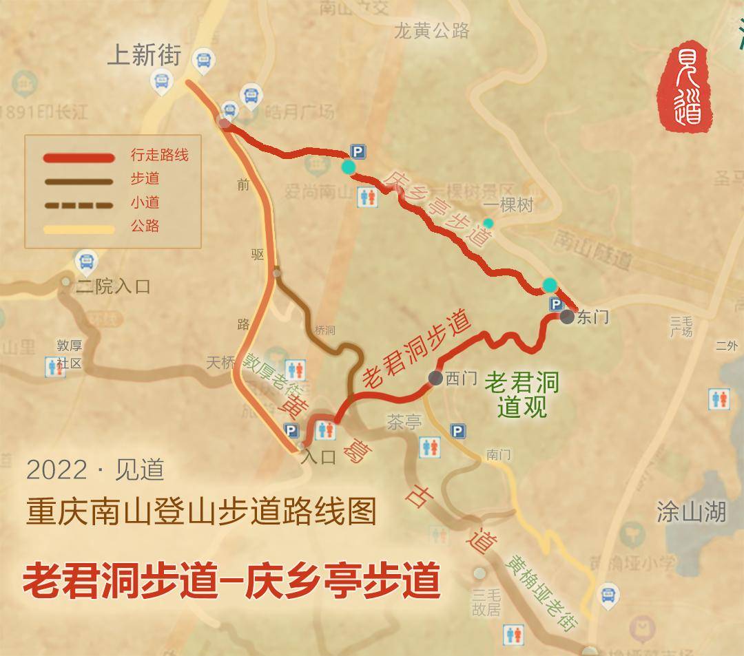 从老君洞东门出去,可走庆乡亭步道下山,形成环线。