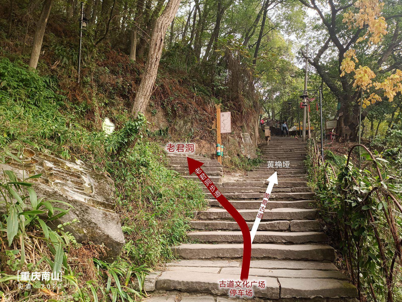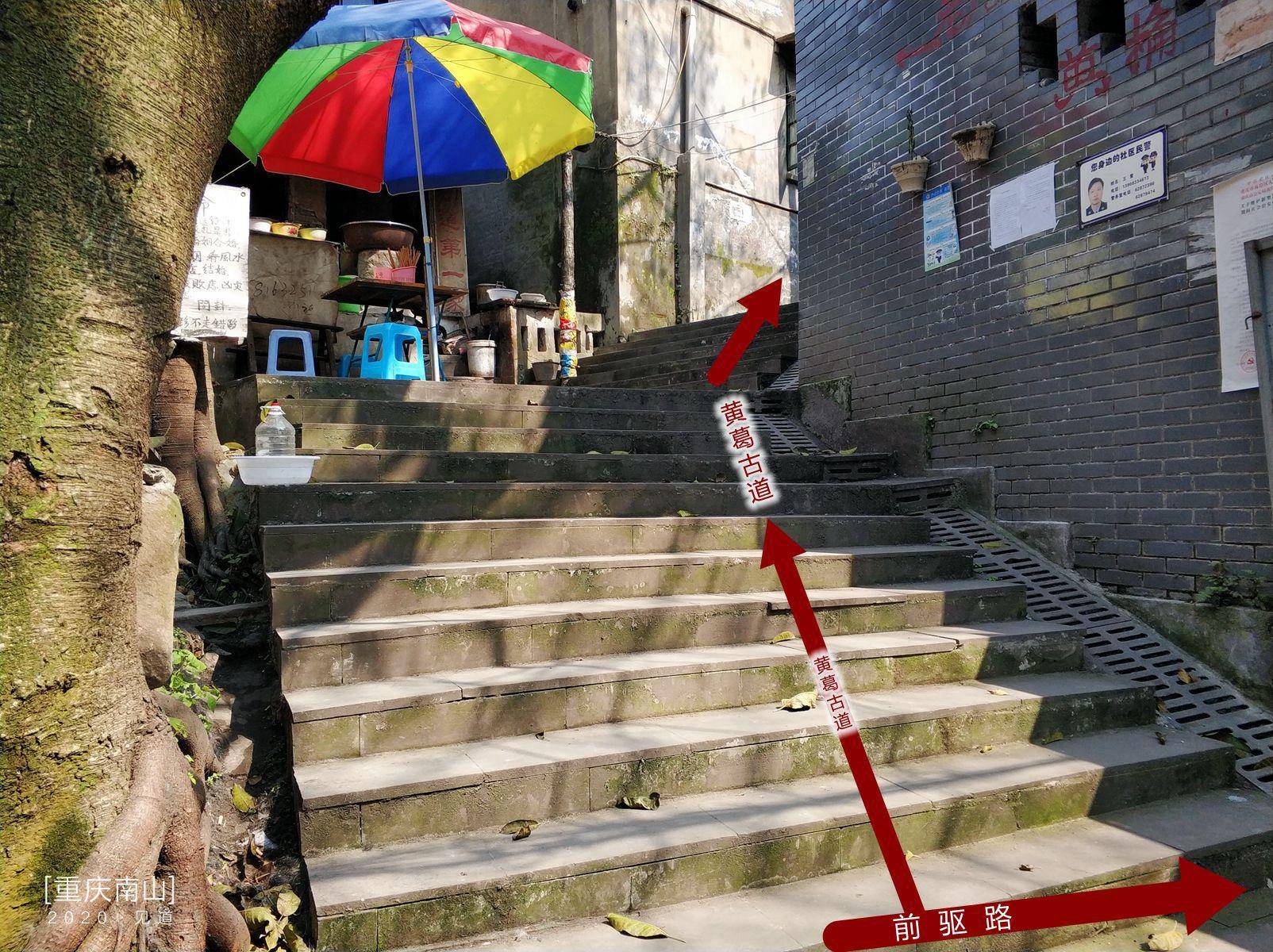 路口有黄葛古道标识牌,沿步道台阶往上走即可。