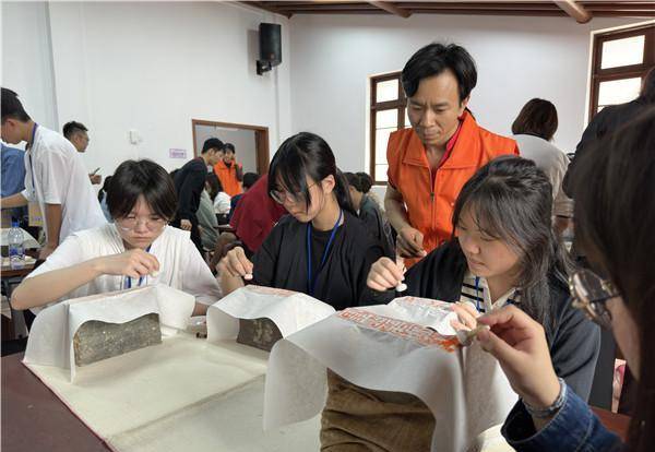 “拓片是一种使用宣纸和墨汁印制文字、图案的技能。”在“拓历史之痕,印文化之韵”活动现场,拓片装裱修复技艺传承人杨军向游客们耐心介绍拓印技艺。一块古砖、一张宣纸、一支毛刷、一盒墨汁、一个拓包,望着眼前的材料和工具,听着老师生动的讲解,游客们禁不住跟着老师动起手来。伴着“哒哒哒”的细微声响,拓包在湿润的宣纸上有节奏的翻飞,宣纸上逐渐显露出古砖石刻的轮廓,最终不同的文字和图案也清晰呈现。