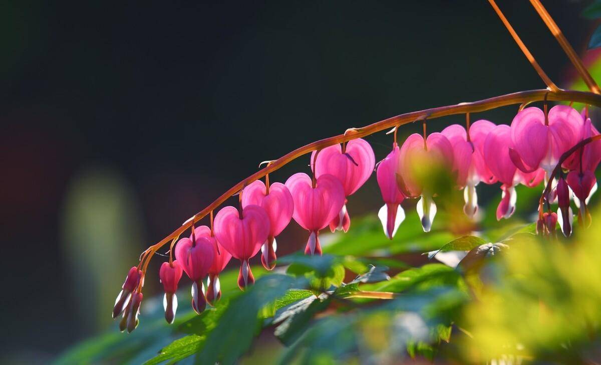 有一种牡丹花,小小的花苞如心形,一朵一朵挤在一起,一排排地挂在枝干上,像一排红色的铃铛,又像一个个小荷包,仿佛在等一阵微风吹过,它们就会发出悦耳的“歌声”,难得一见!原来,它叫,荷包牡丹。