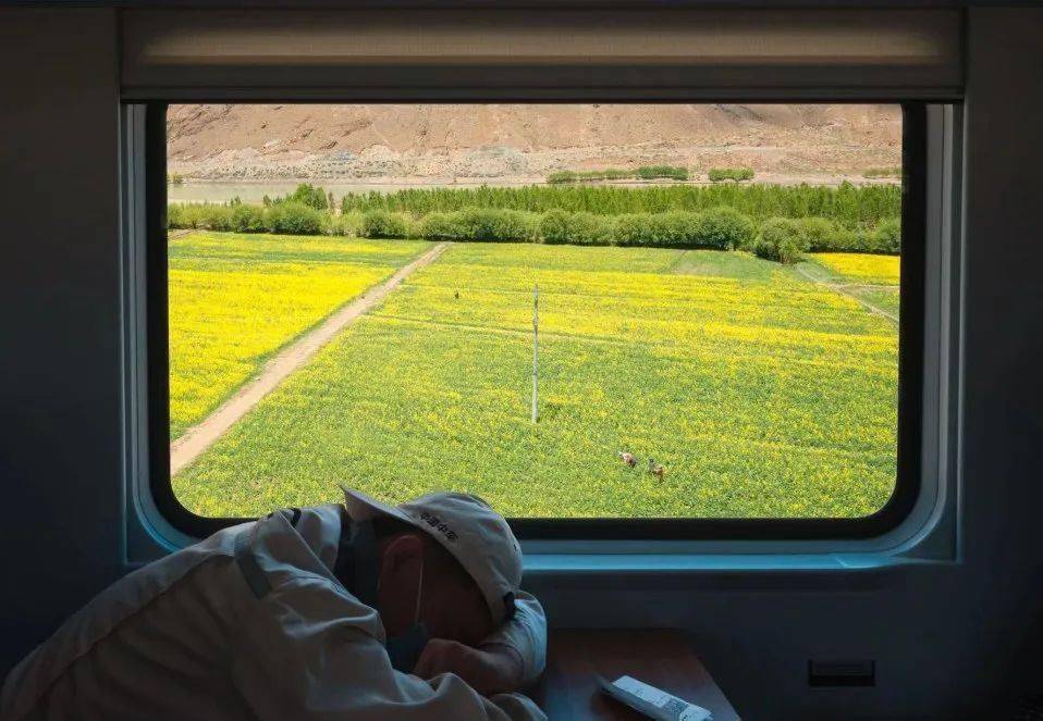 这个时节坐上这趟列车可以欣赏到金黄的油菜花田、延绵的江水,又或是远处雄伟的南迦巴瓦和成片的古桃林。