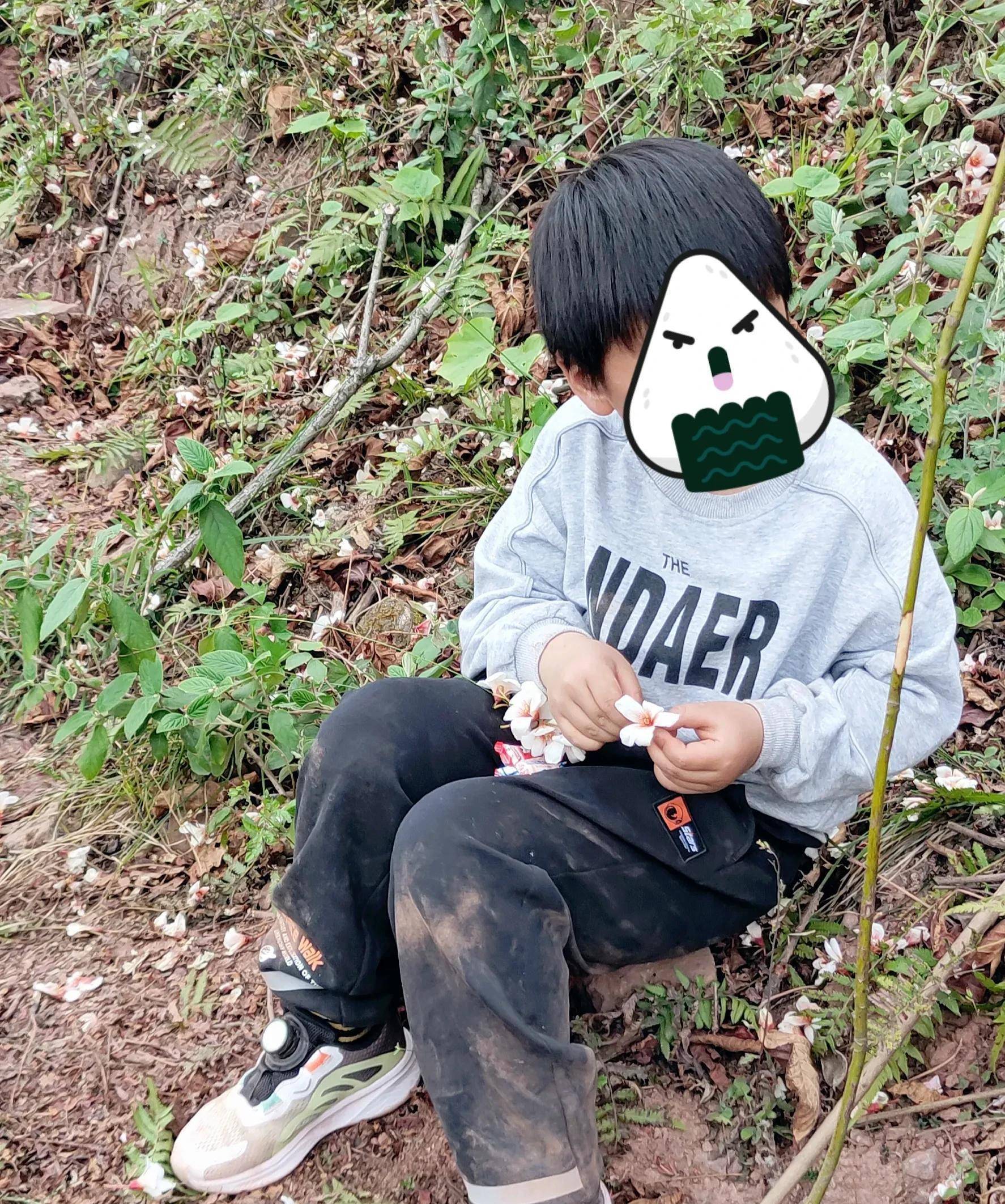 幺儿学着那些有心的大人,拾掇林间的落花,用梭梭草串起来编制花环。因为有个小女孩头顶带着桐子花环,好看极了。我问他,你编了谁戴,他说:“给你戴啊。”