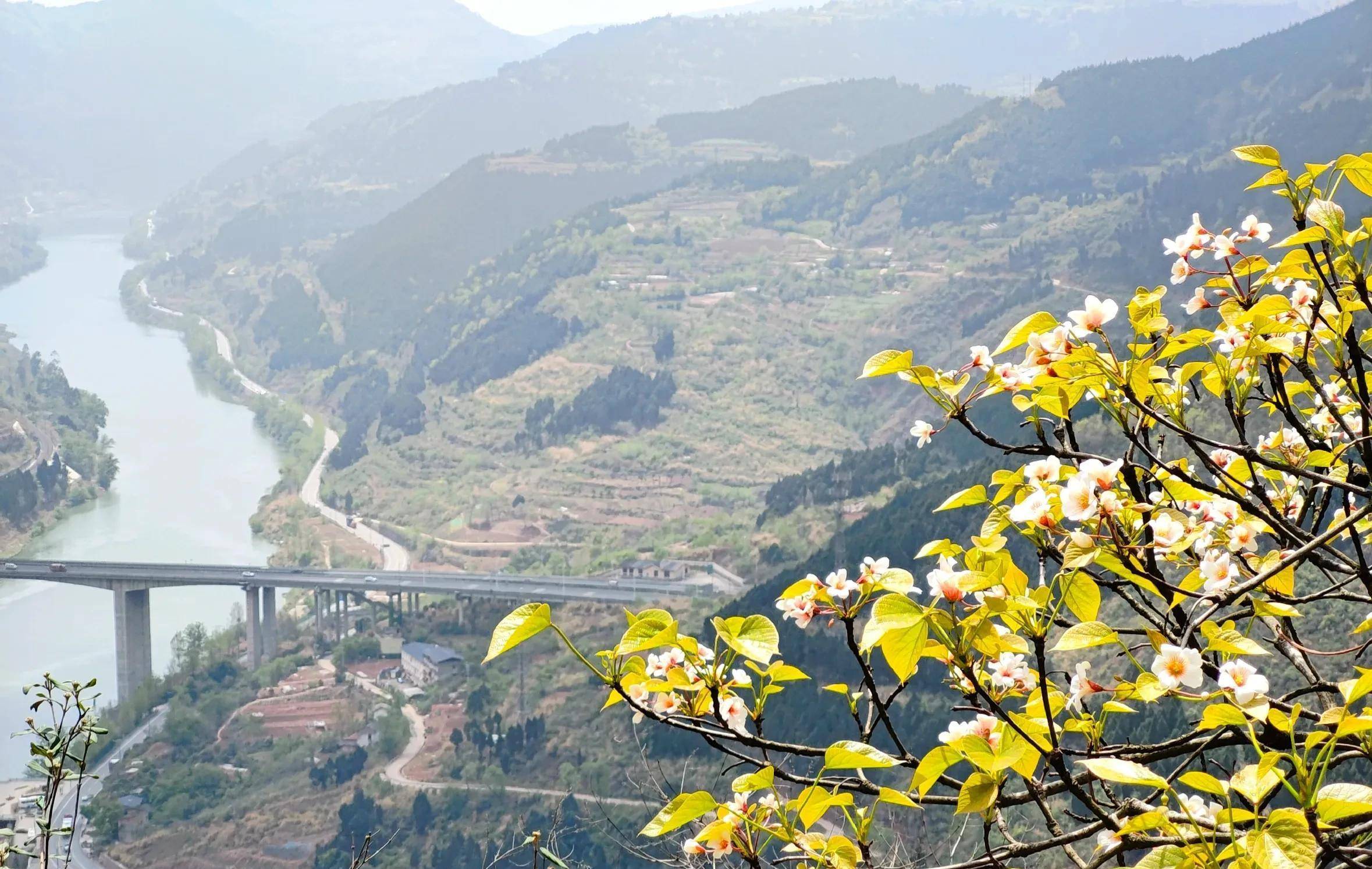 停好车,在一处小卖部前,视野开阔,满山坡的桐子花就那样突兀地出现在视野,没有惊艳,而是满满的亲切。而山下,沱江横卧在山脉之中,逶迤而来。