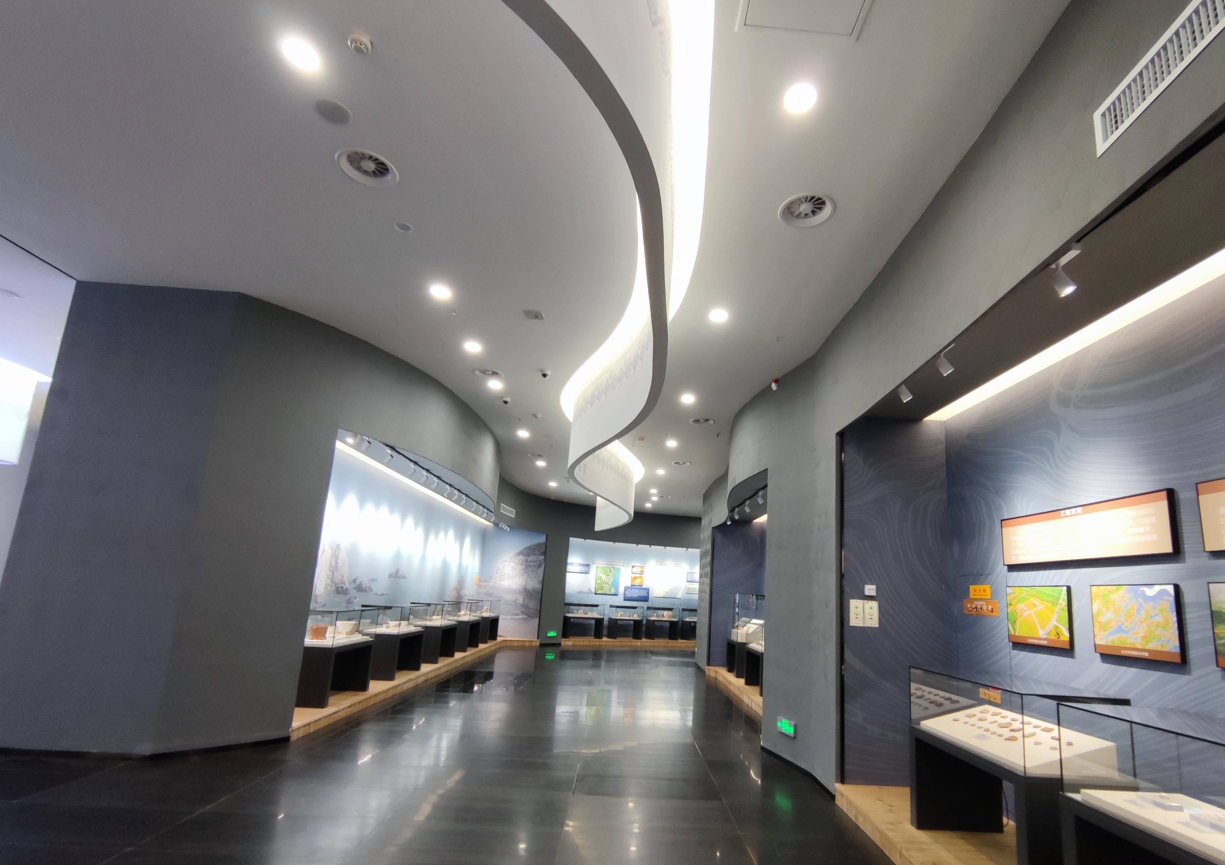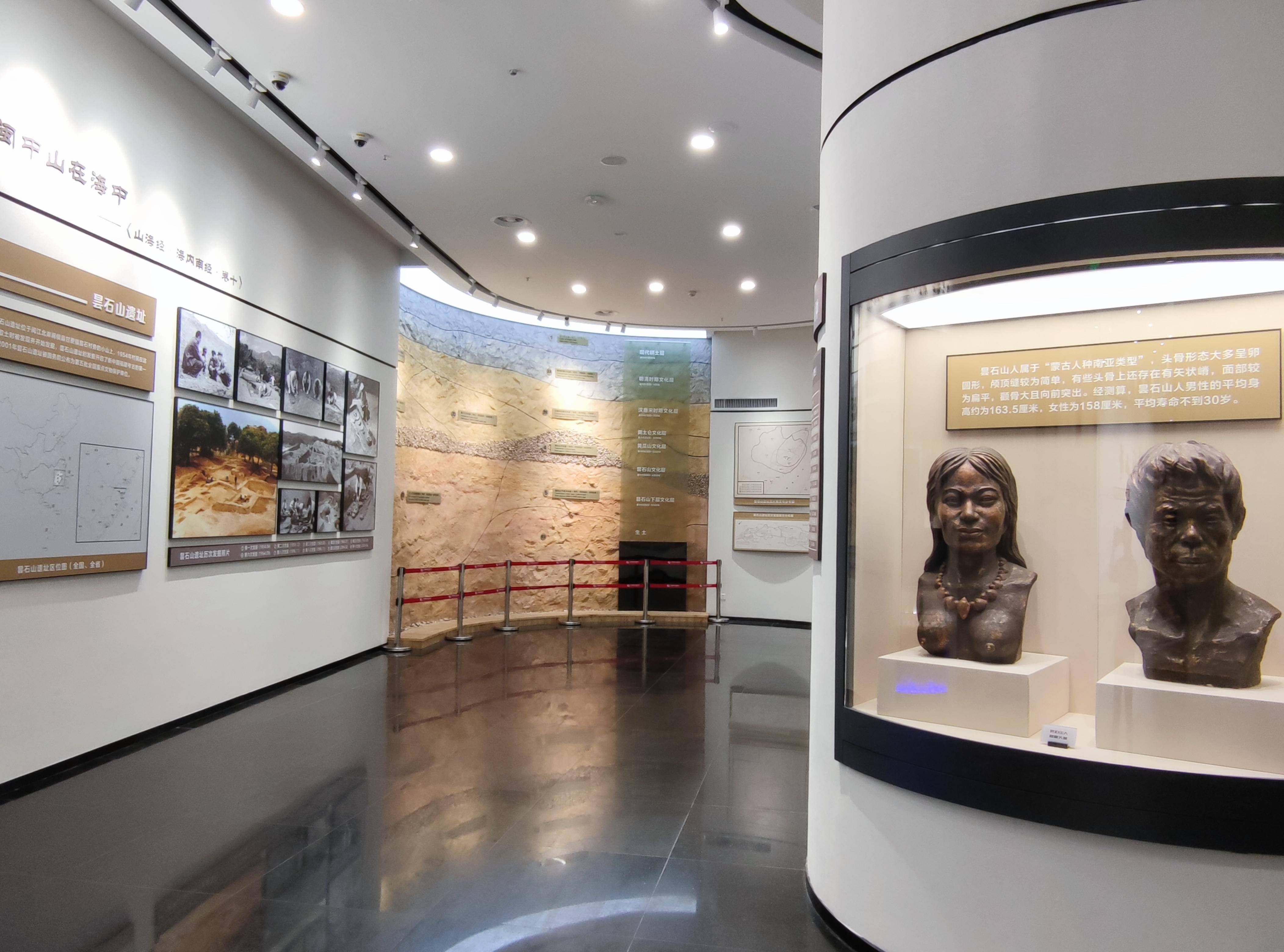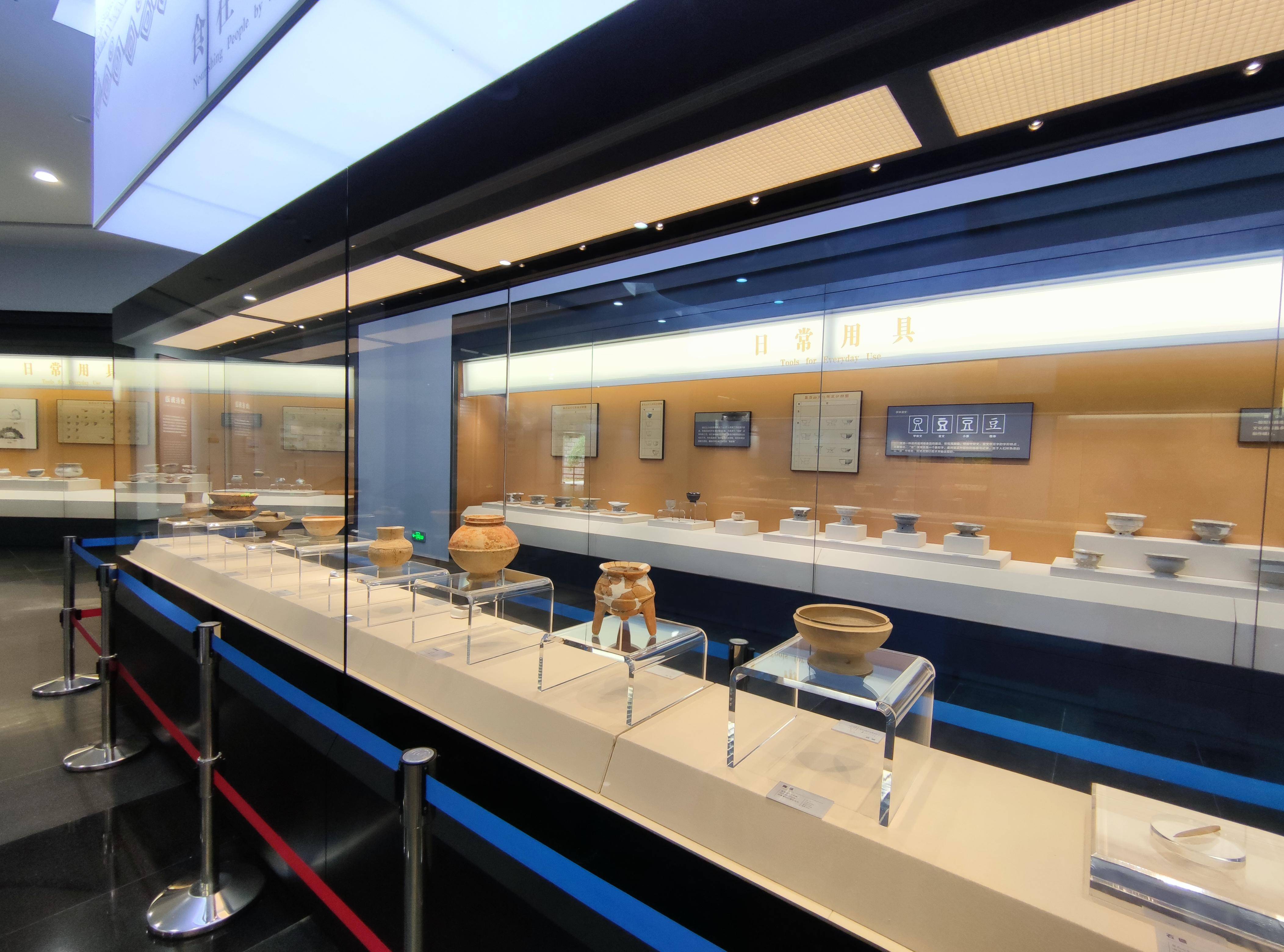 参观完一楼的展厅,乘电梯上到楼顶,穿过一大片草坪,来到另一头的遗址展厅。是要穿上鞋套进去的,因为我们是站在玻璃上往下看当年的遗址的。