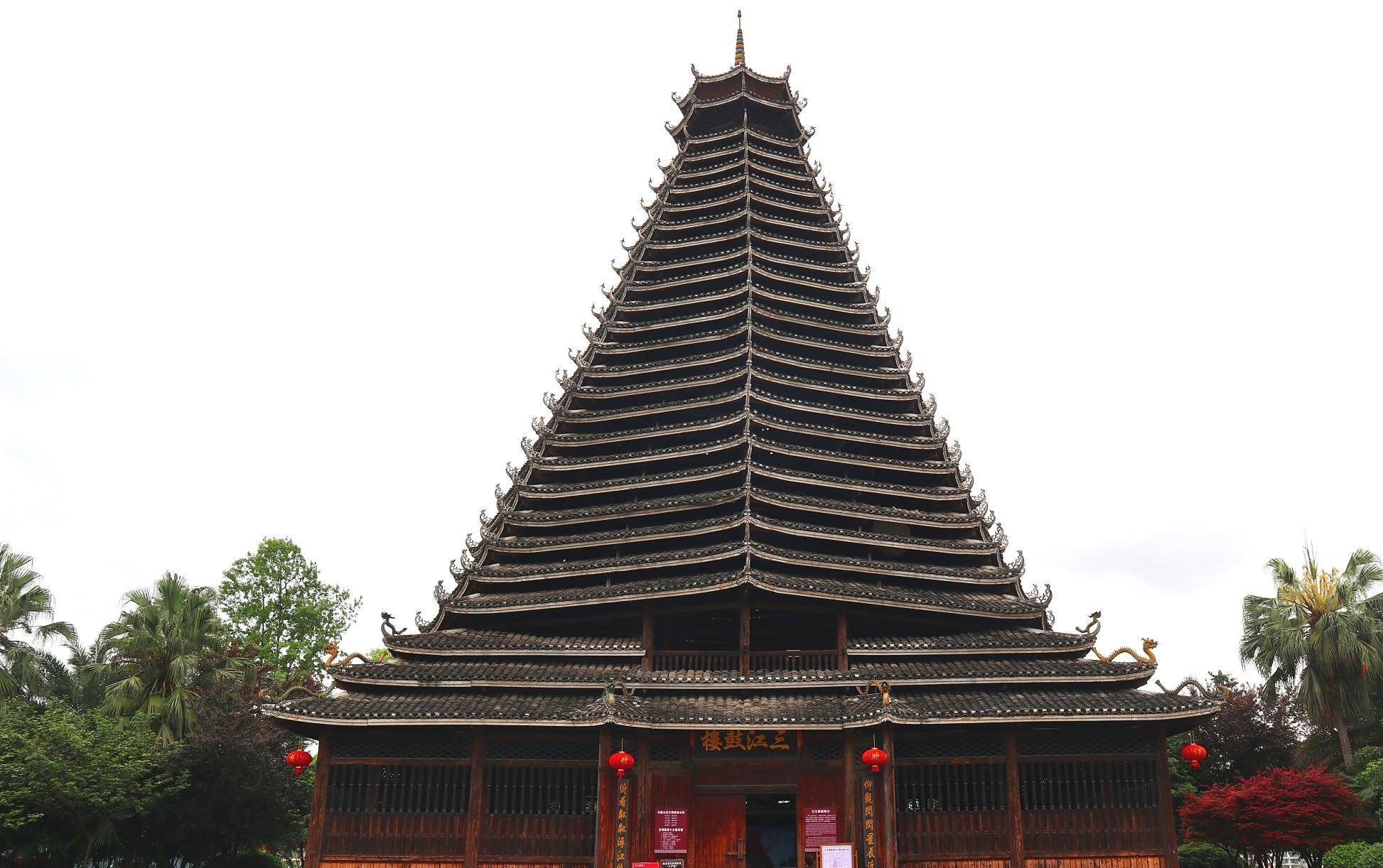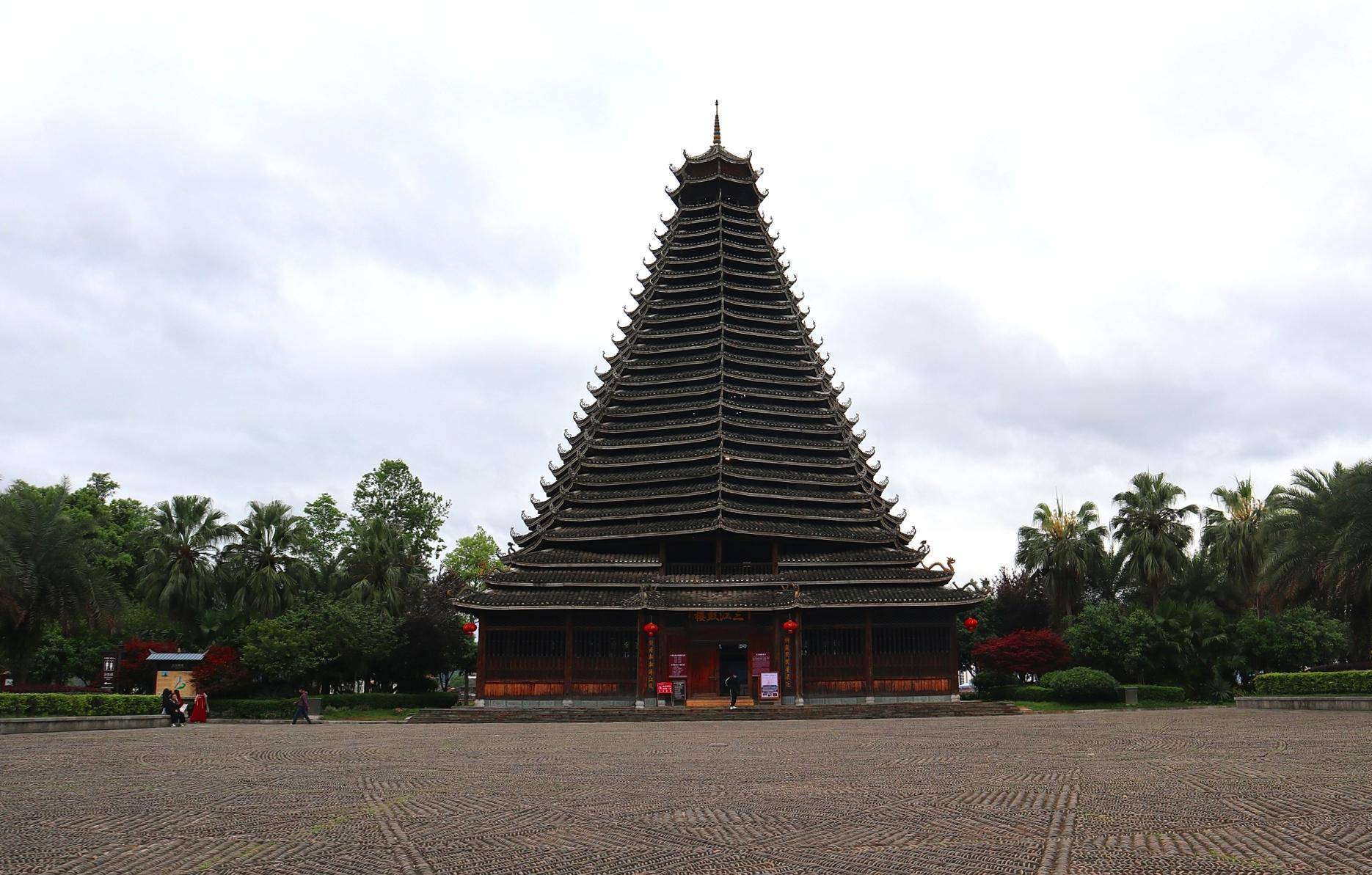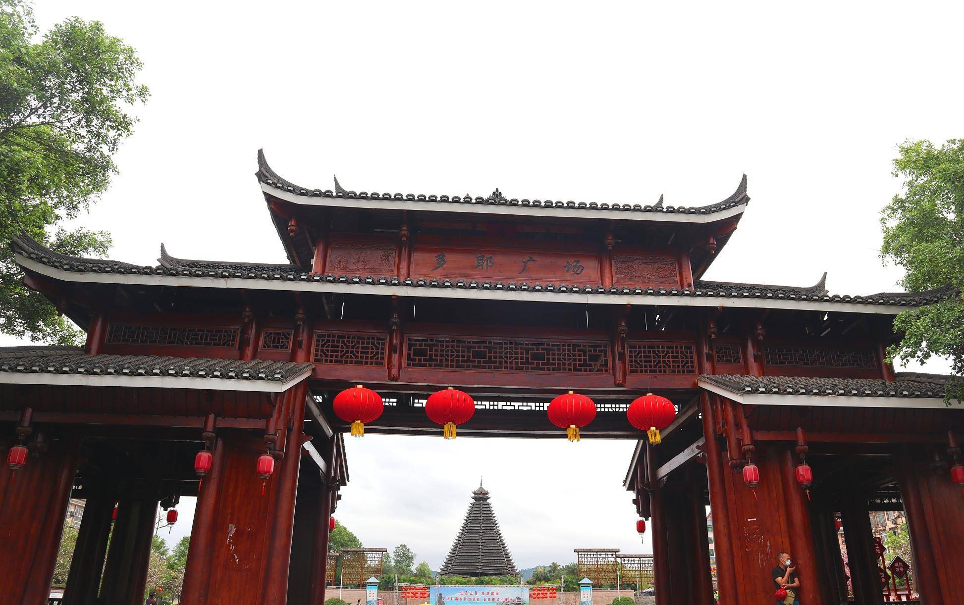 多耶广场的上层就是三江鼓楼,它被誉为“世界第一鼓楼” ,是大侗寨的标志性建筑,楼前设有传统的鼓楼坪,是侗乡群众集会、待客、多耶、踩堂的重要场所。