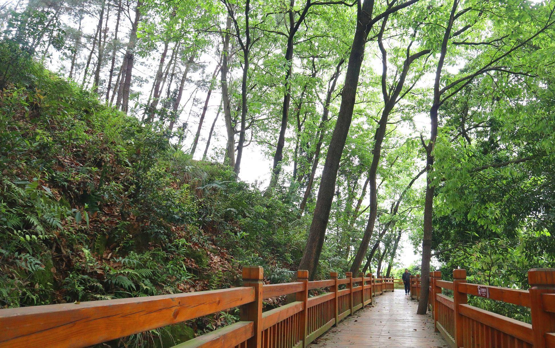 福禄公园里有一条木质健身步道,环境清幽,从林荫处穿过,直达江边观景台。