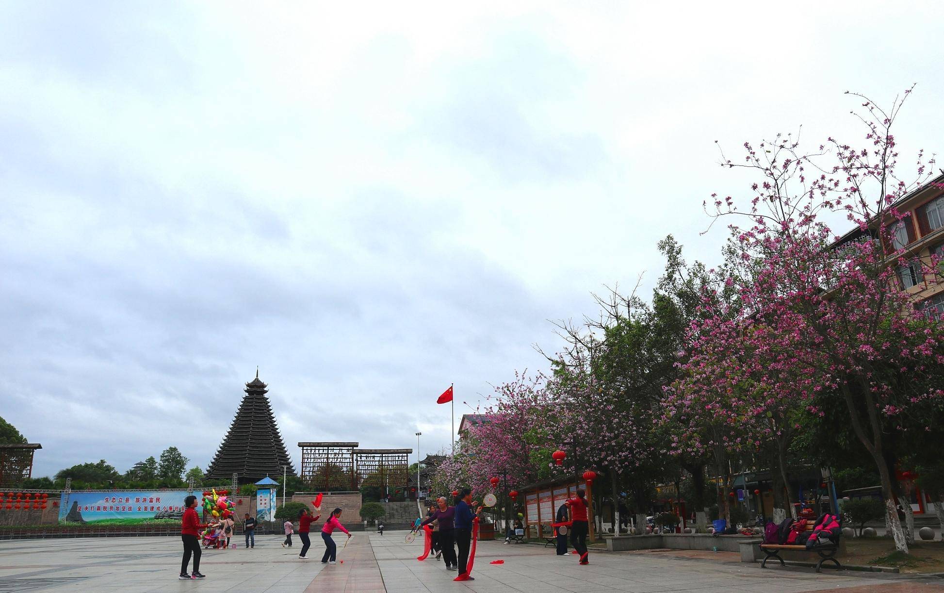 多耶广场的中间是侗族民俗风情浮雕、人工瀑布和音乐喷泉;下层由周边的木构廊亭、花草树木、三江奇石等组成的地面上雕刻着三江县全貌地图,大家习惯称之为“民族的广场、侗乡的客厅”,广场上一群阿姨正在挥舞红绸翩翩起舞。