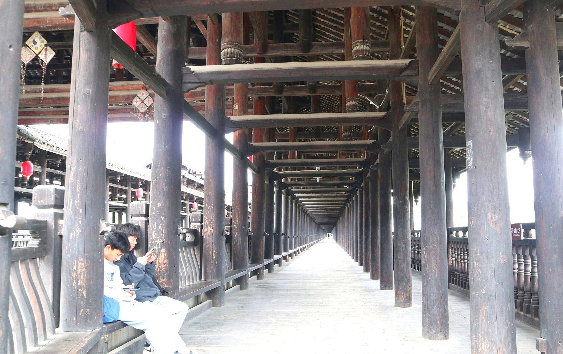 风雨桥桥面为双车道,两侧为人行道,各宽4米。人行道长廊里设有“美人靠”,供行人观赏和休息,两名中学生模样的男孩正在玩手机。