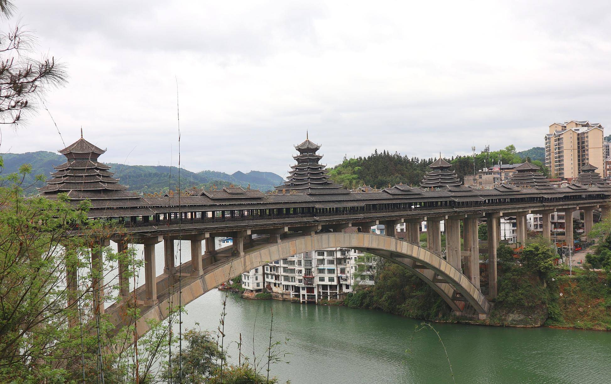 福禄公园的观景台上,是远观三江风雨桥全貌的最佳位置。风雨桥的下半部分为钢筋水泥结构的拱桥,犹如一道彩虹跨越浔江两岸。桥的上半部分为木质的廊桥,七座亭塔,二百九十二间桥廊,宛若长龙腾空。